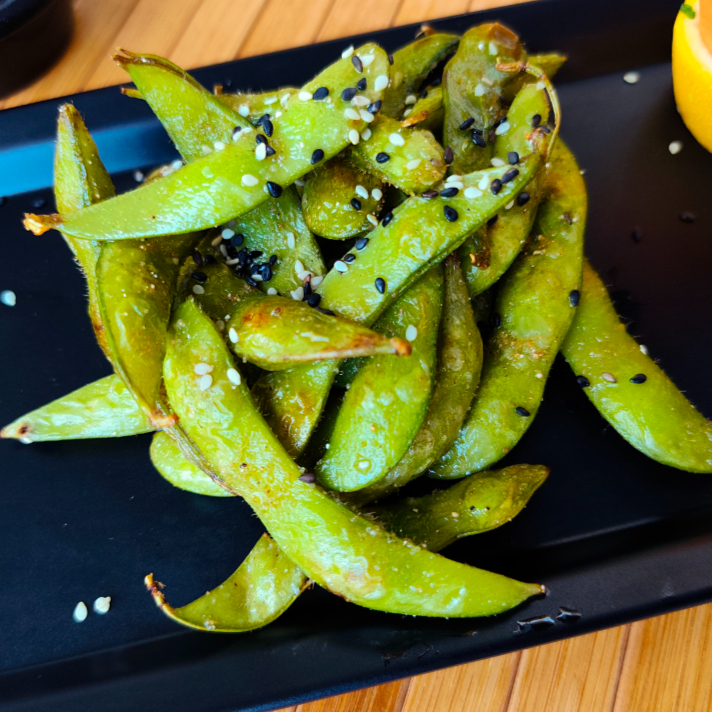 Vainas de Soja cocinadas, sal y ajonjolí