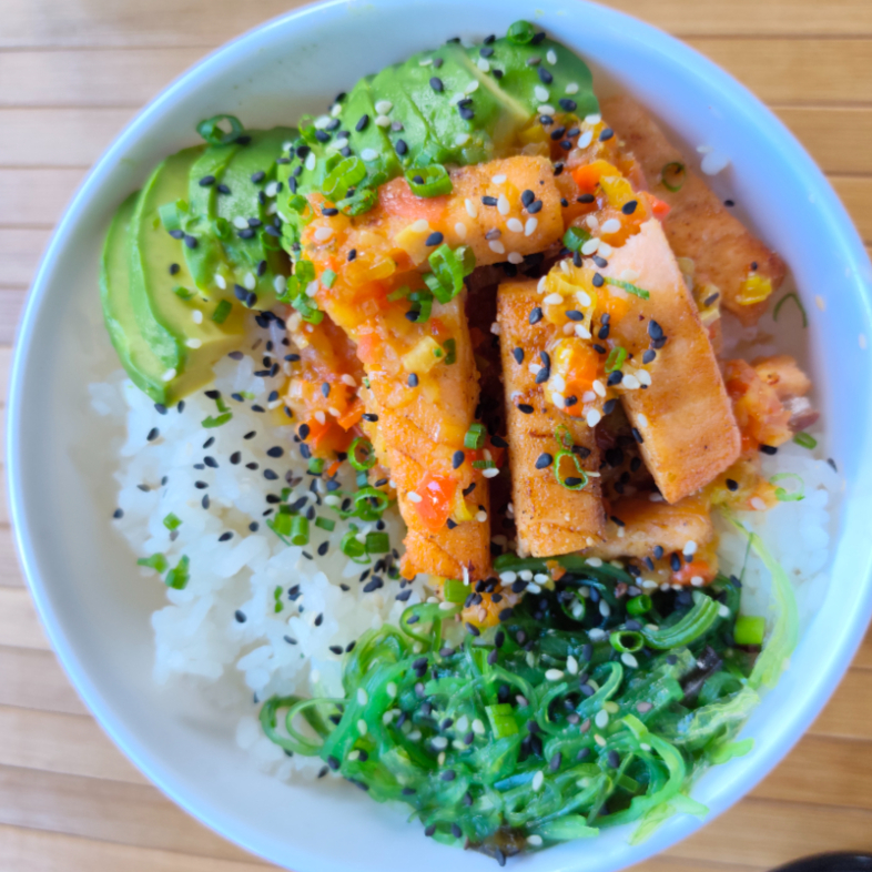 Salmón a la plancha, hogao, ensalada algas, aguacate y arroz gohan