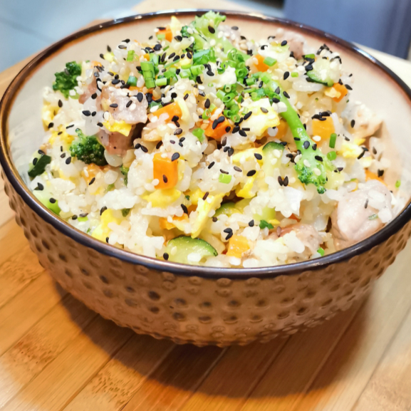 Pollo, arroz frito, huevo, cebolla, zanahoria, calabacin, brocoli, ajonjolí
