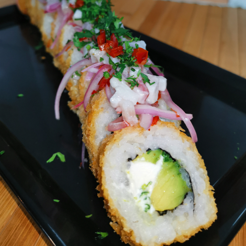 Queso crema, aguacate, cebollin, frito en panko. Cubierto en ceviche peruano. 10 bocados