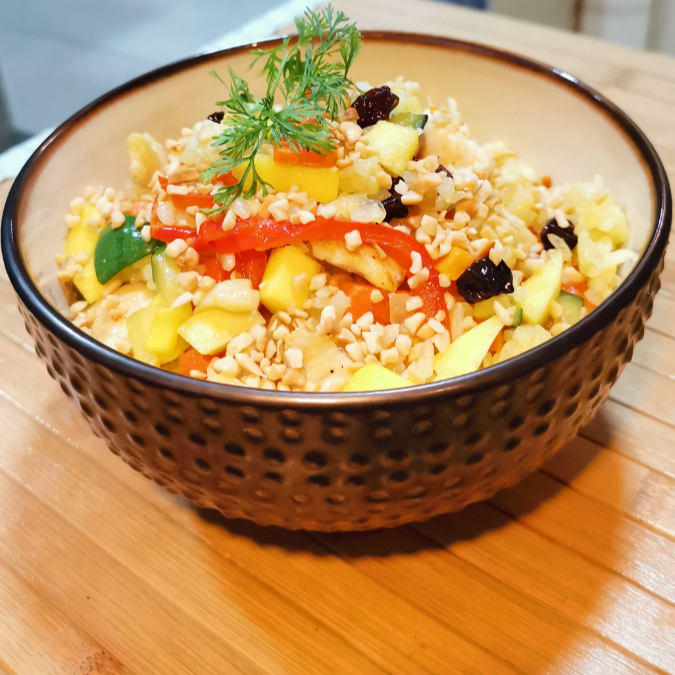 Pollo o Cerdo, arroz frito, cebolla, zanahoria, calabacin, pimentón, pasas y coco