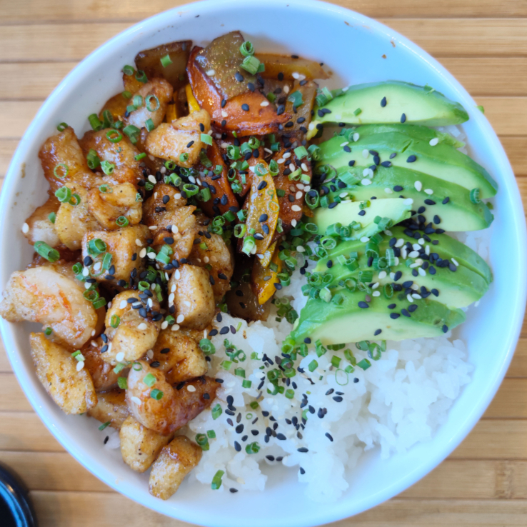 Pollo, camarón y verduras estilo chaufa, aguacate y arroz gohan