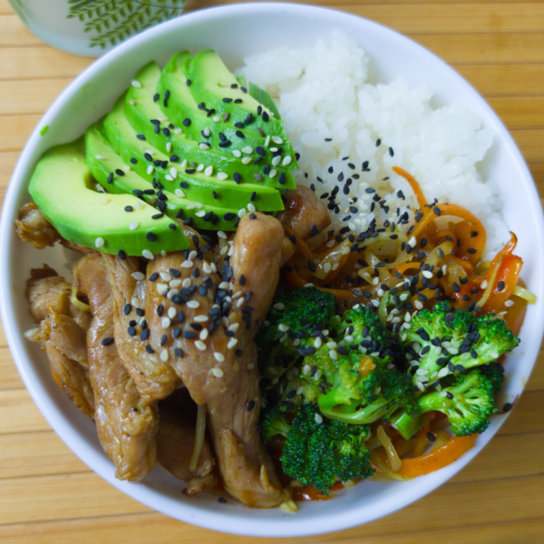 Cerdo con verduras salteadas, aguacate y arroz gohan