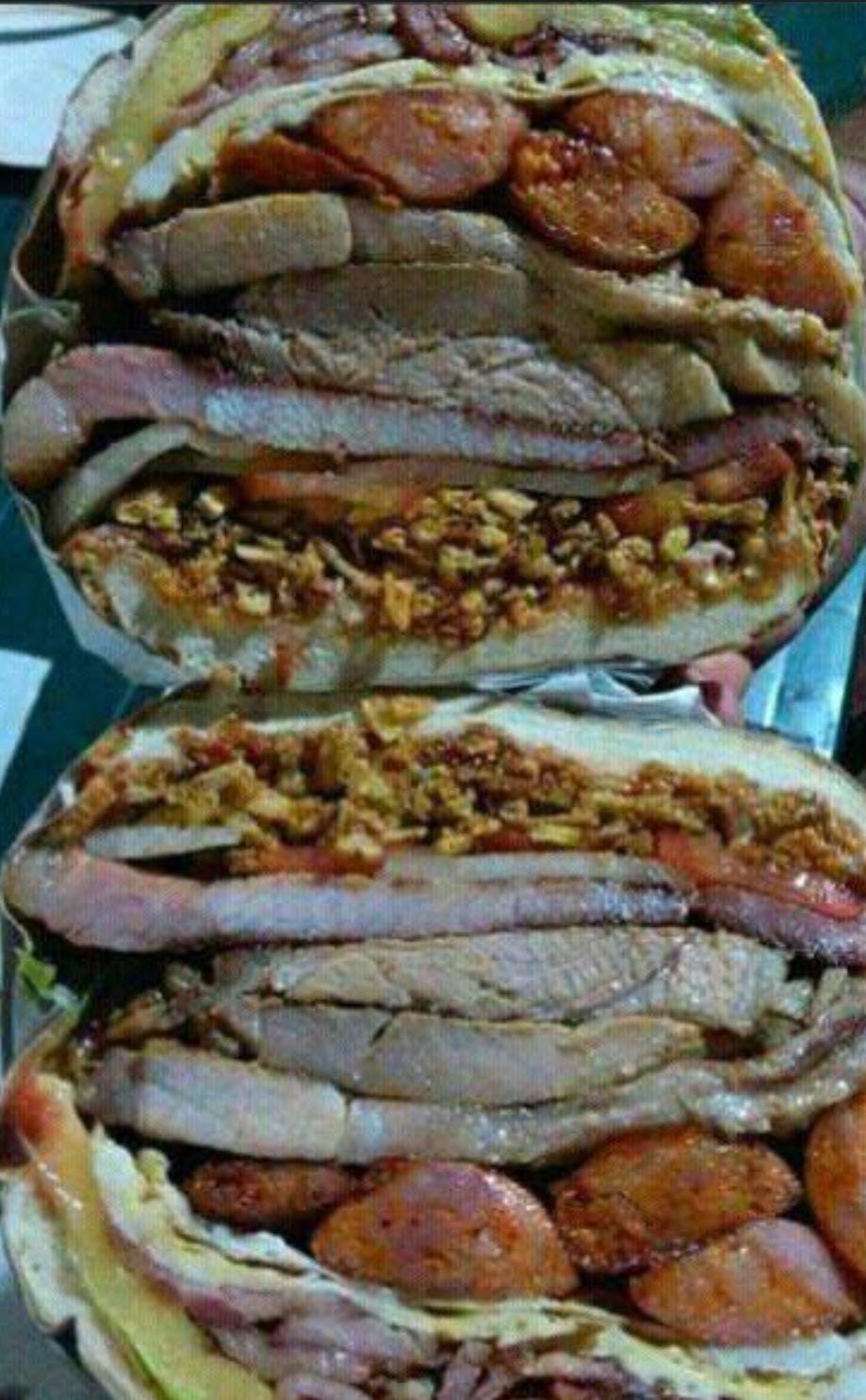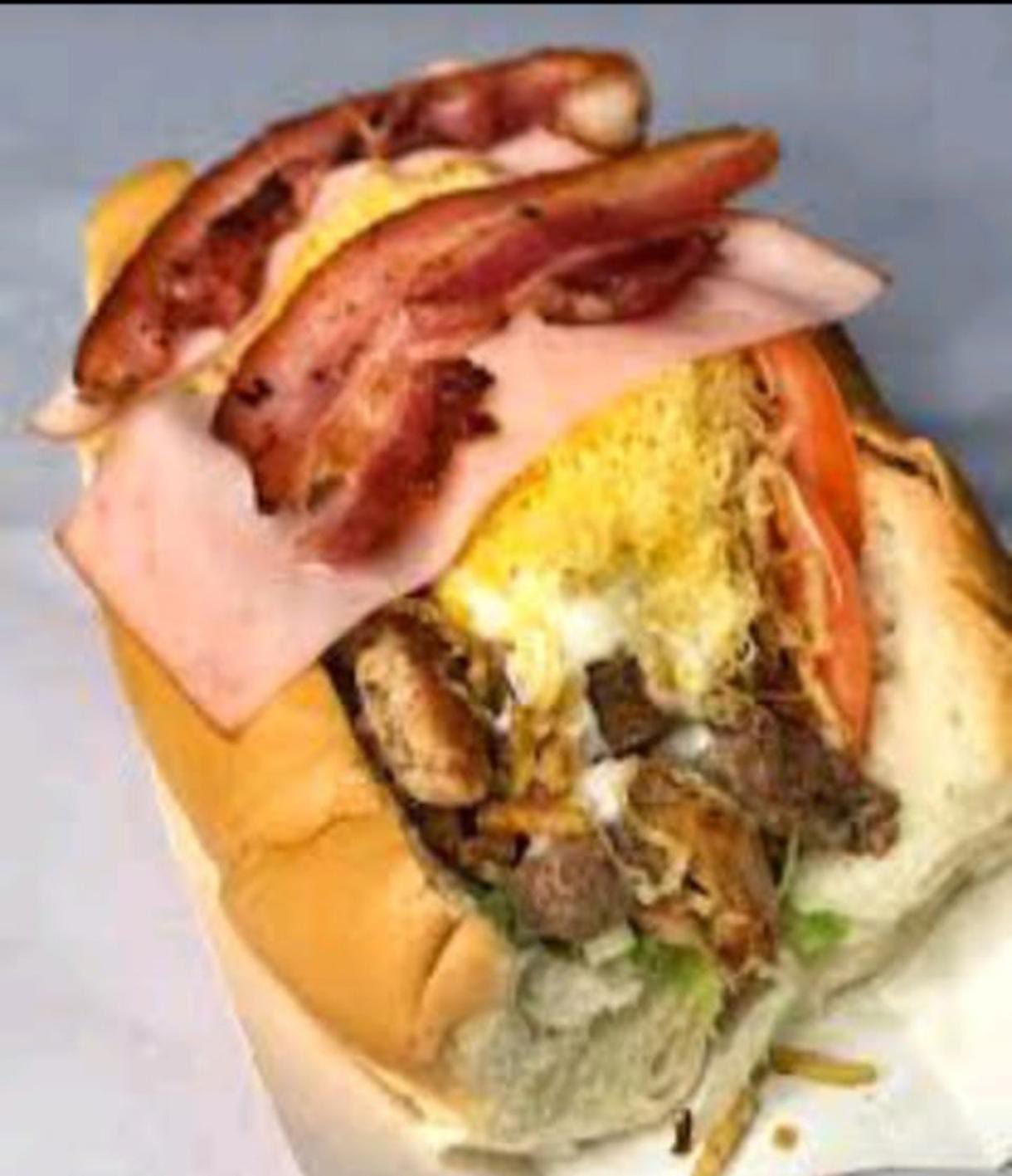 Pan de aprox 50 cm, 150 g de carne, 150 g de pollo, chorizo, aguacate, lechuga, tomate, queso, doble tocineta, maíz tierno y ripio.