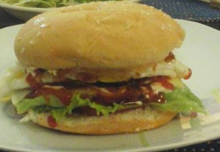 Pan brioche, carne de hamburguesa o filete de cerdo, tocineta, jamón, doble queso, huevo frito, lechuga, tomate y ripio de papa.