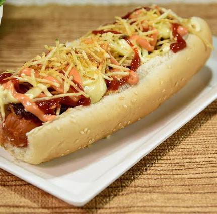 Pan, salchicha, 50 g de carne y 50 g de pollo, 100 g de queso, ripio, ensalada (repollo, zanahoria y cebolla) y salsa de la casa.