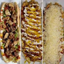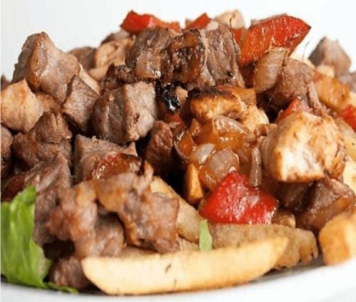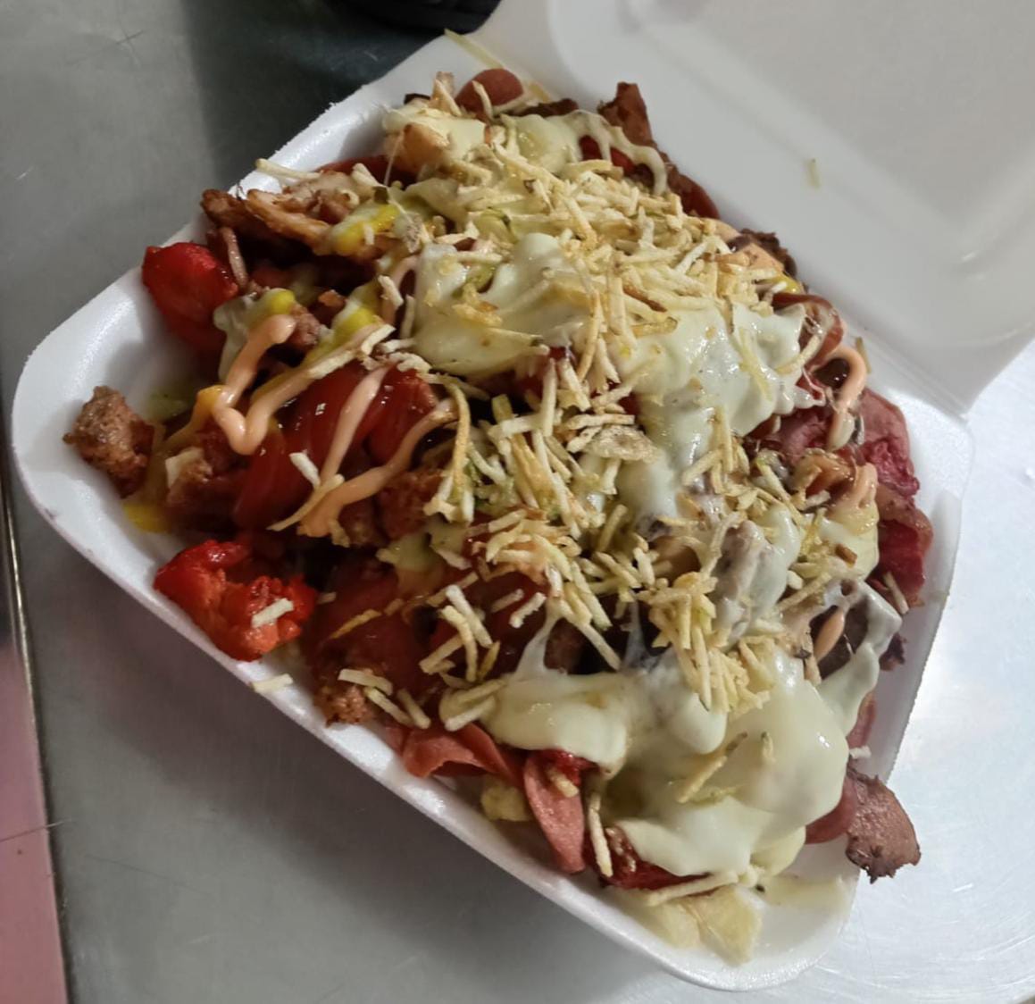100 g De carne, 100 g de pollo, 100 g de chorizo, 250 g de papas a la francesa, 250 gramos de salchicha, queso fundido, salsa de la casa, salsa de tomate, salsa de piña, salsa rosada y ripio.