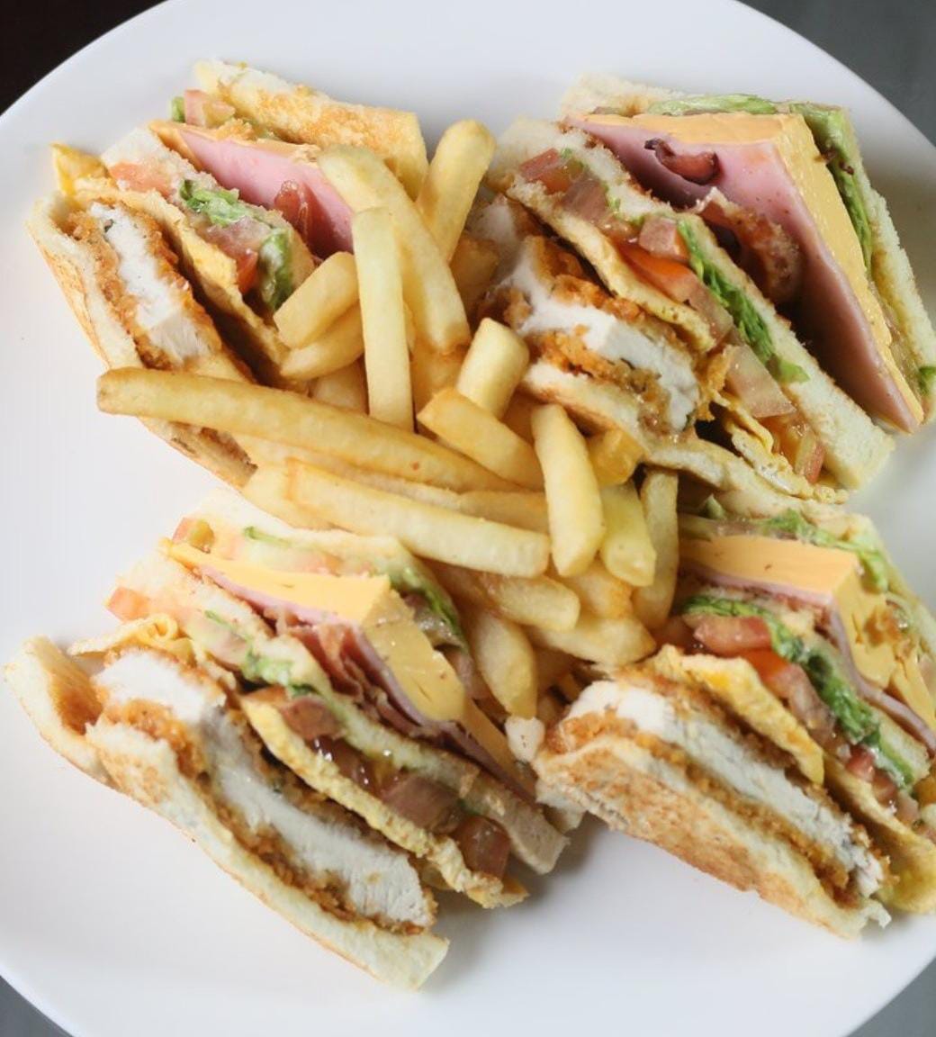 4 Panes de sándwich, 1 filete de cerdo, tocineta, jamón, queso, lechuga, tomate y 150 gramos de papas a la francesa.