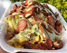 150 g De papas a la francesa, 150 gramos de salchicha, salsa de la casa, salsa de tomate, salsa de piña, salsa rosada, ripio y queso rallado.