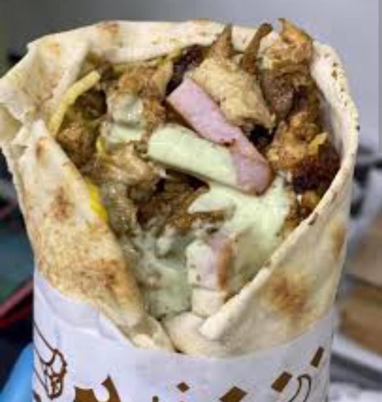 Tortilla xl rellena con 100 g de carne, 100 g de pollo, maíz, queso, lechuga, tomate y cebolla y salsa de la casa.