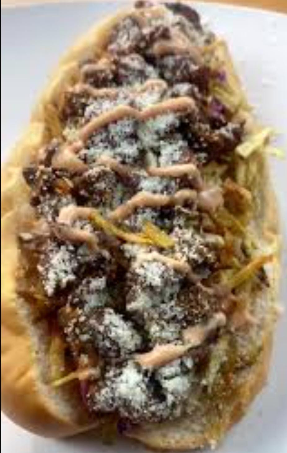 Pan, salchicha, 50 g de carne o pollo a elección, queso rallado, ripio, ensalada (repollo, zanahoria y cebolla) y salsa de la casa.