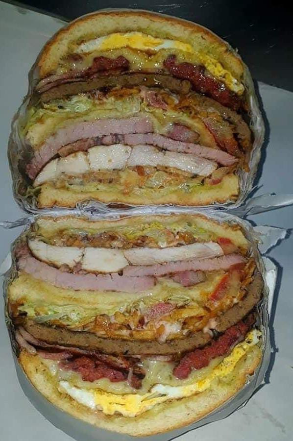 Pan brioche, doble carne de hamburguesa, filete de cerdo, tocineta, jamón, queso, doble huevo frito, lechuga, tomate y ripio de papa.