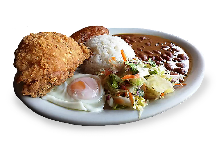 consume, frijol, arroz, maduro ensalada, huevo ,1 presa de pollo,