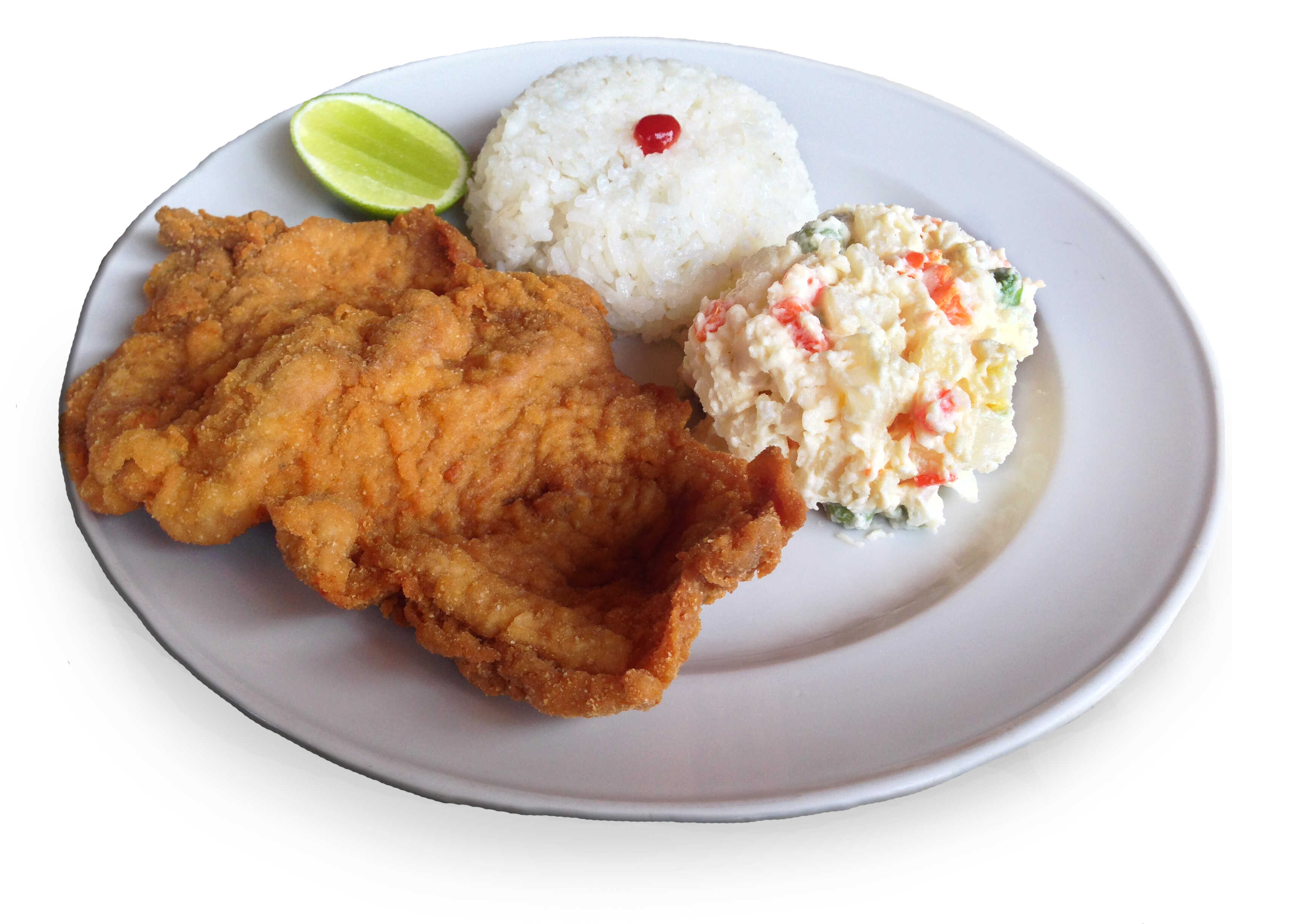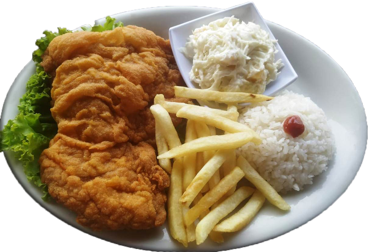 230 grs d efilete de cerdo en chuleta acompañado de arroz, papas a la francesa y ensalada de piña.