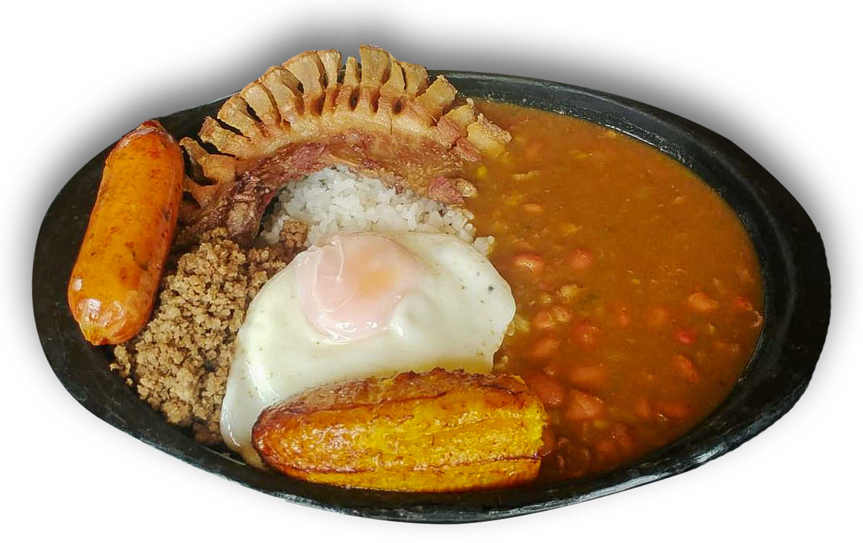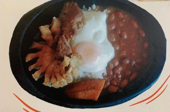 frijoles,chicharron, carne molida, chorizo de cerdo, huevo frito, arroz y maduro.