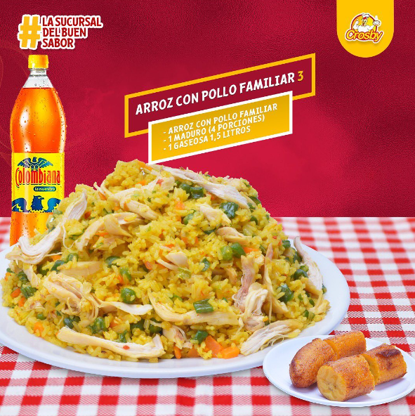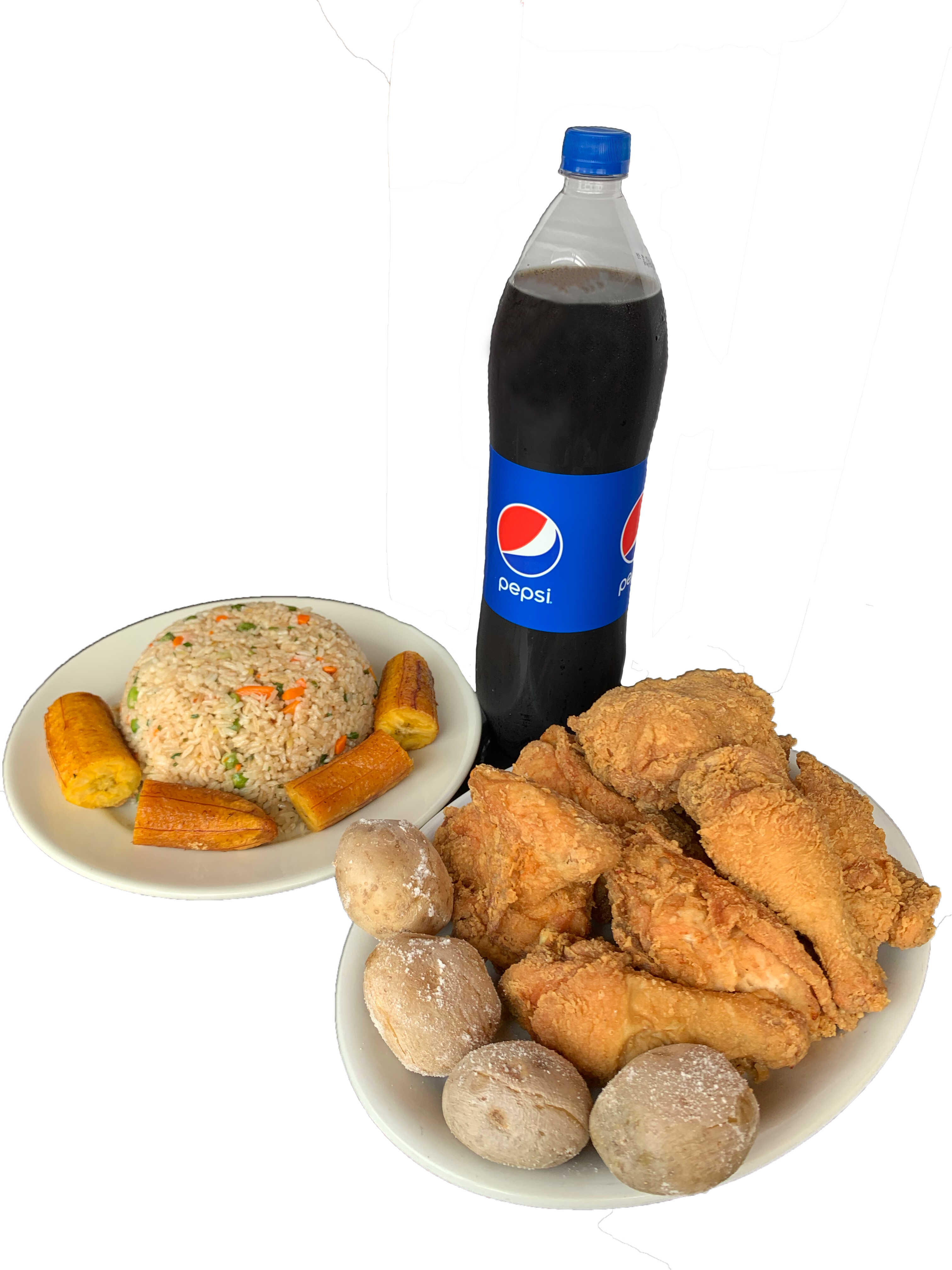 Un Pollo + Arroz Especial + Porción de Papas Cocidas + Porción de Maduro + Gaseosa Postobon 1.5 Lt