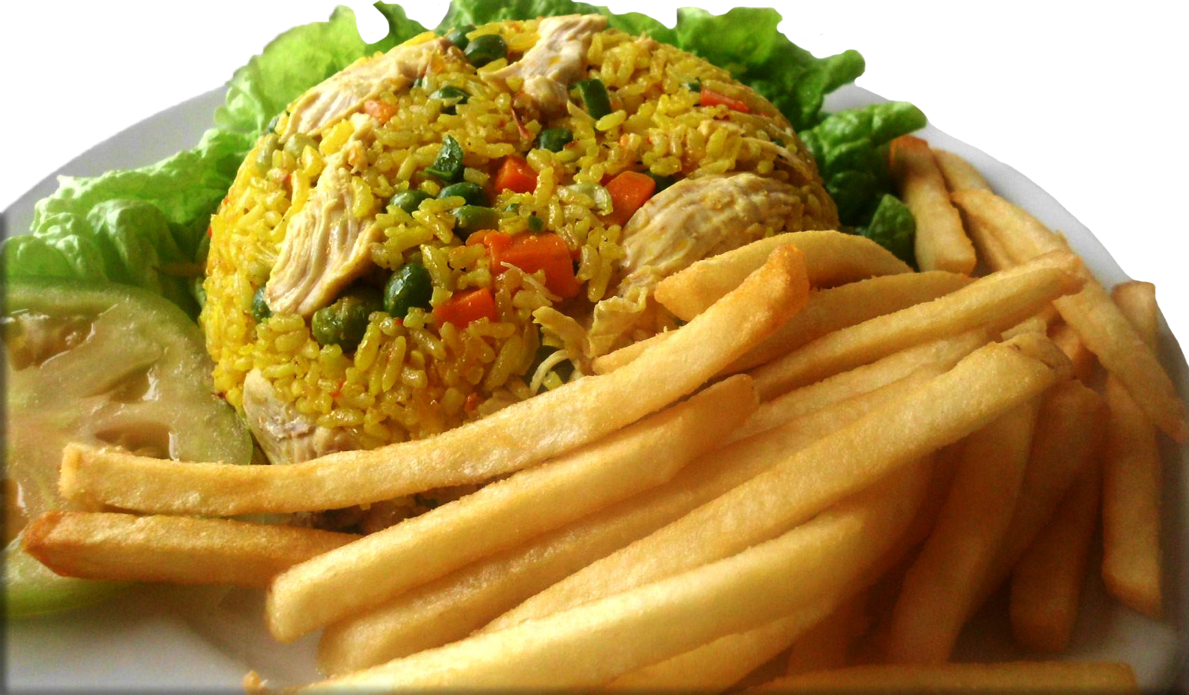 mezcla de arroz con verduras, pechuga de pollo y salsa de la casa, acompañado de francesa.