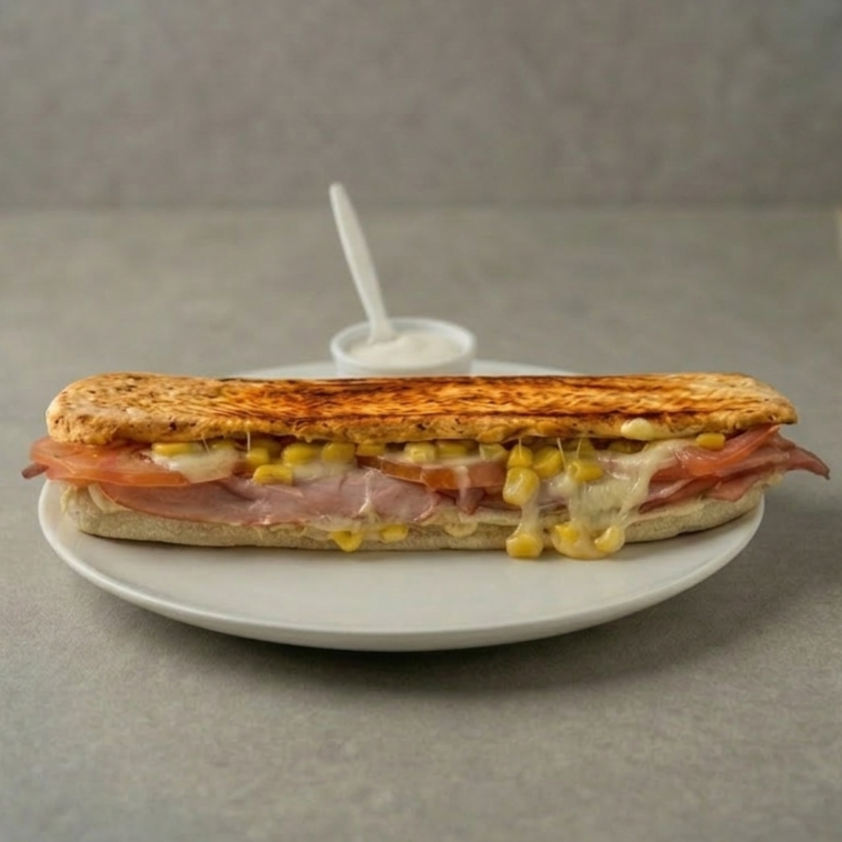 Pan artesanal finas hierbas, tocineta ahumada, maicitos, queso mozzarella, tomate y lechuga + salsa de ajo de la casa 21 CM