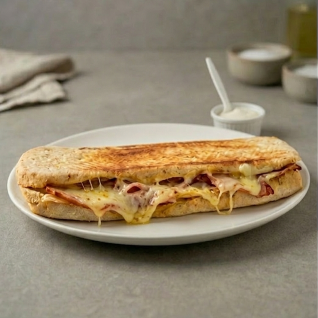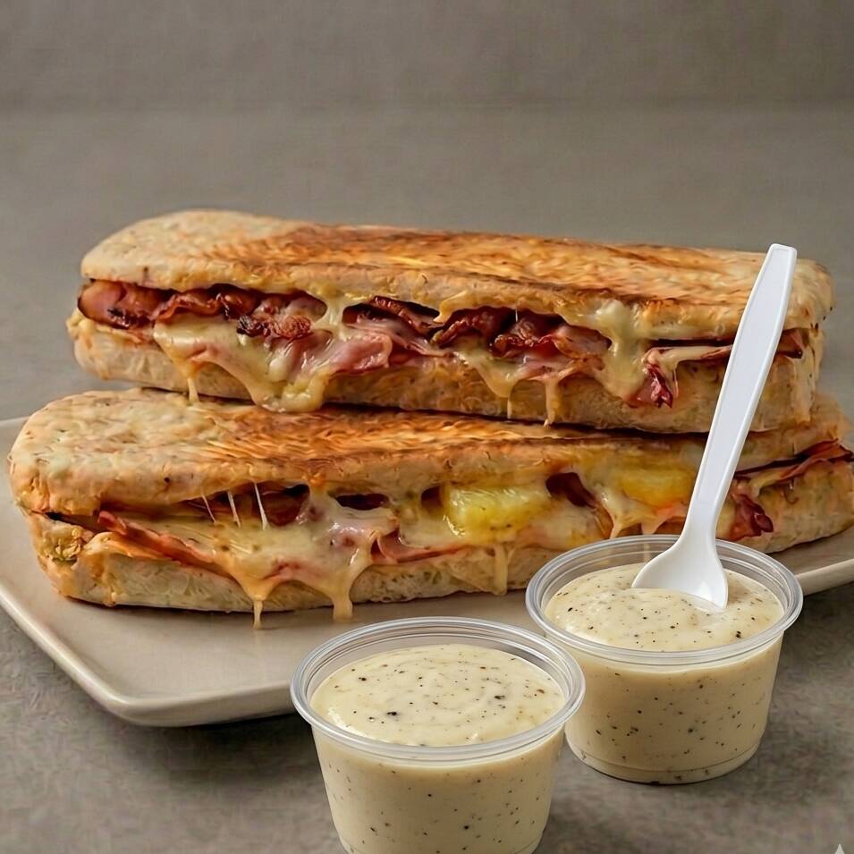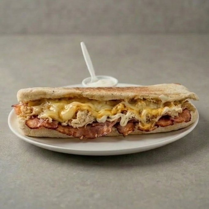 Pan artesanal finas hierbas, jamón de pierna de cerdo, pollo desmechado, tocineta ahumada, queso mozzarella, tomate y lechuga + salsa de ajo de la casa 21 CM