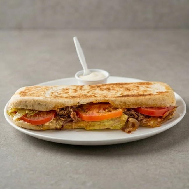 Pan artesanal finas hierbas, carne desmechada, cebolla caramelizada (opcional), queso mozzarella, tomate y lechuga + salsa de ajo de la casa 21 CM