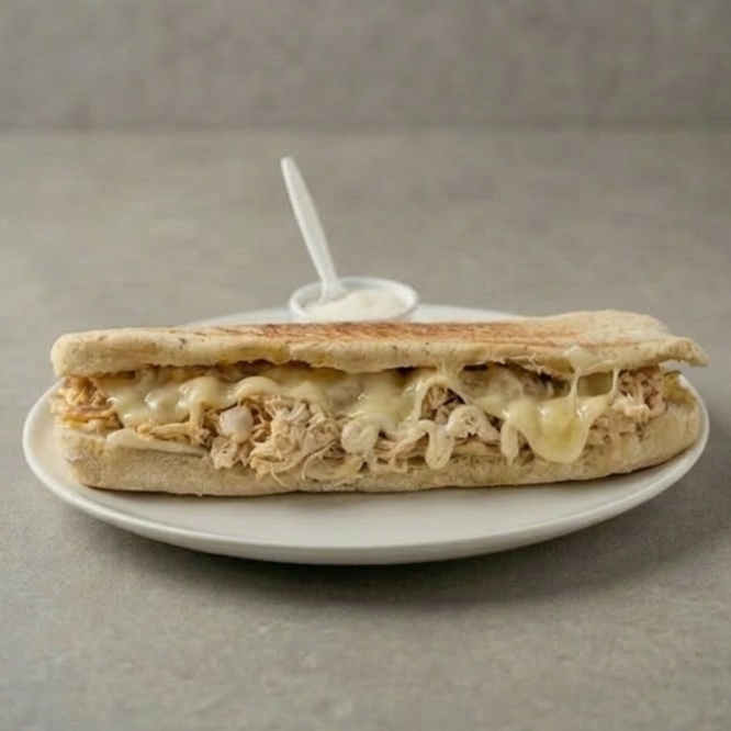 Pan artesanal finas hierbas, pollo desmechado, queso mozzarella, tomate y lechuga + salsa de ajo de la casa 21 CM