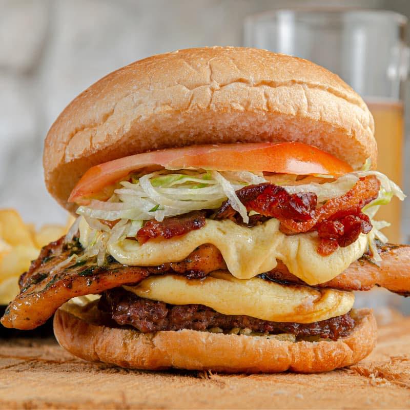 Pan, salsa de la casa, lechuga, carne, tomate, salsa de tomate, ripio de papa, doble queso y tocineta.