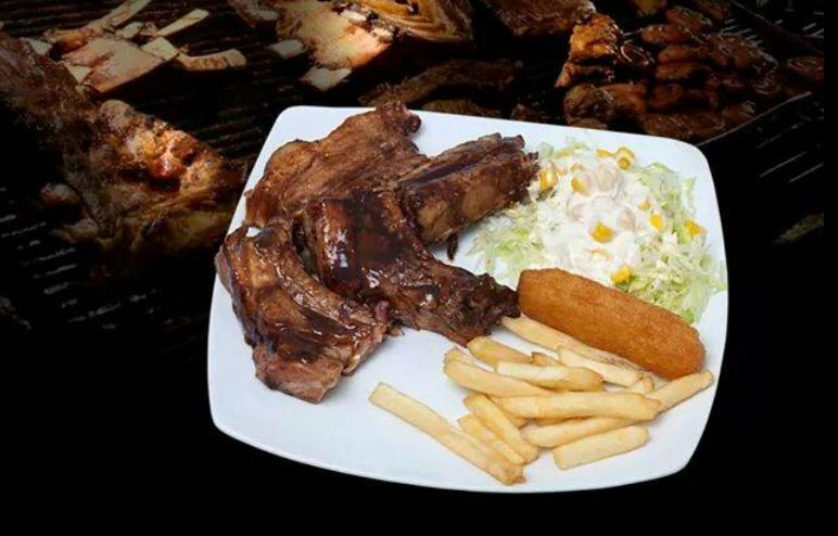 filete de pollo, res, costilla de cerdo, acompañado de papa a la francesa y ensalada.