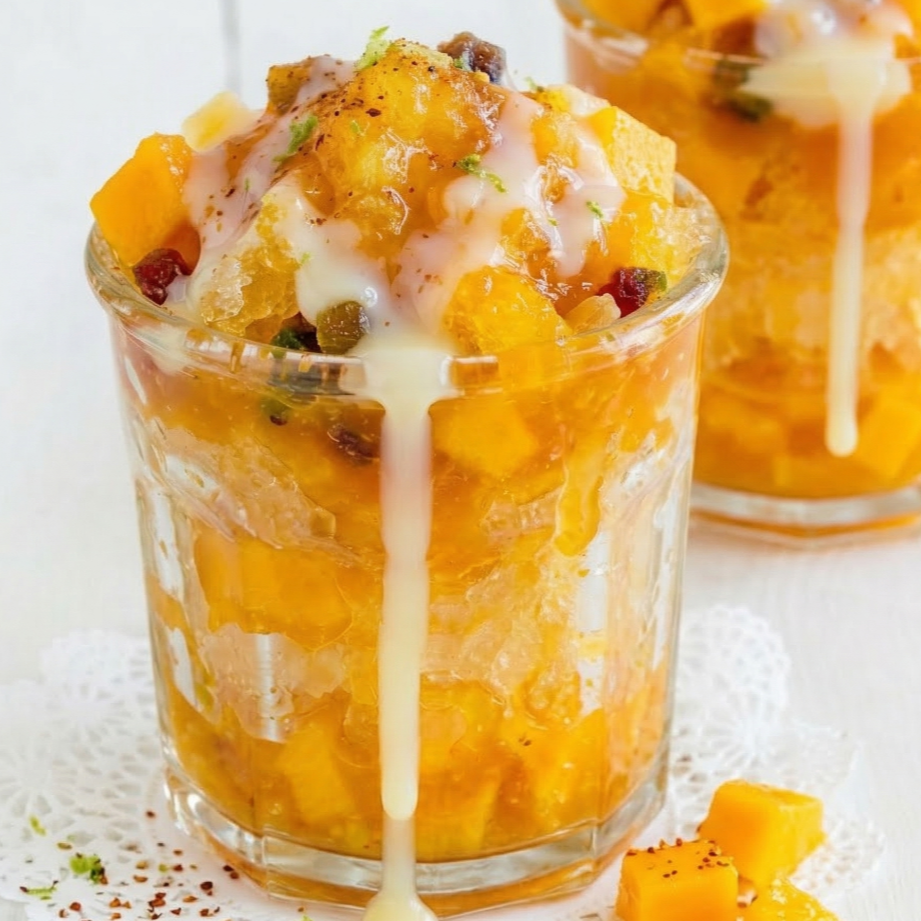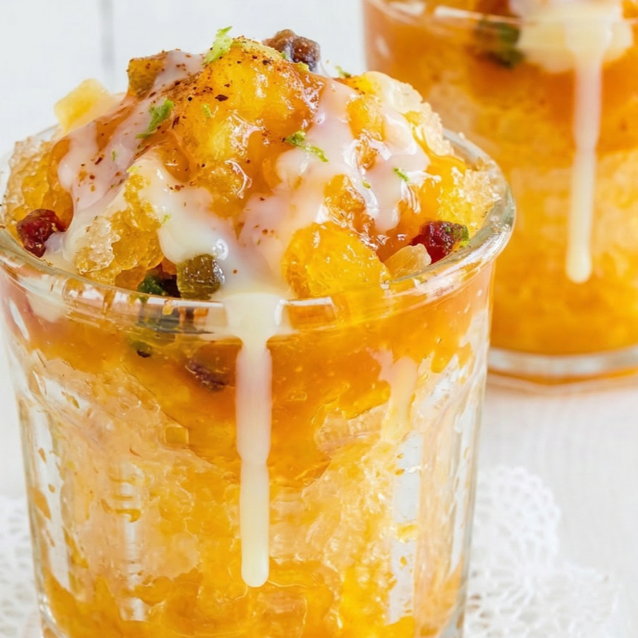 Delicioso raspado tradicional con jugo agridulce acompañado de leche condensada, acompañado de fruta a eleccion