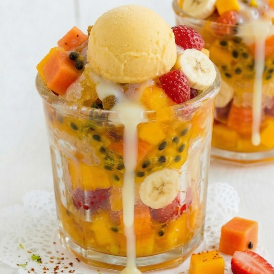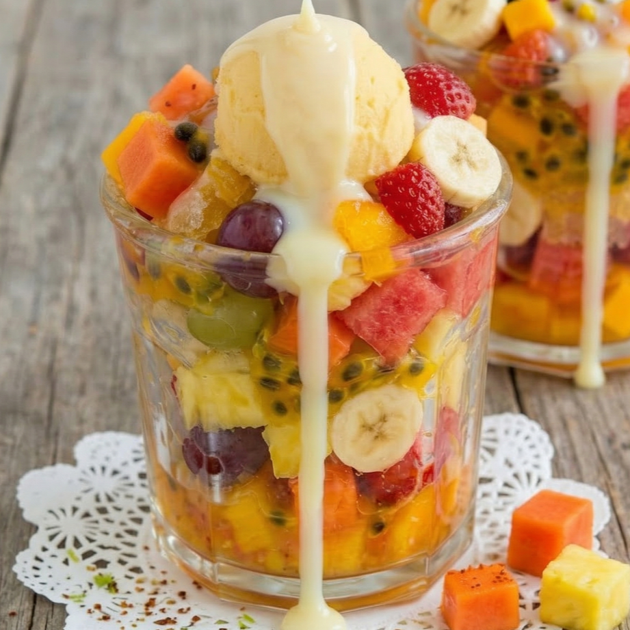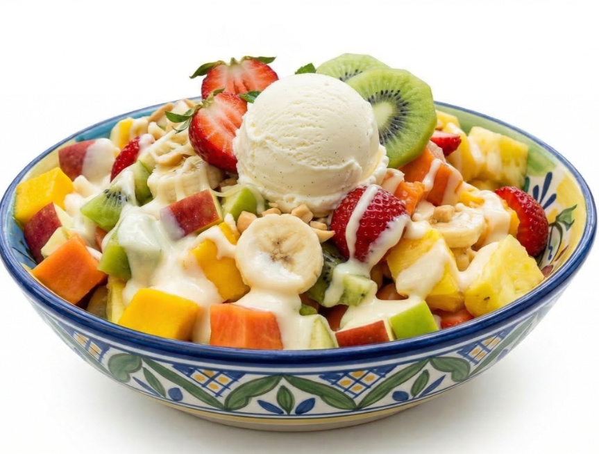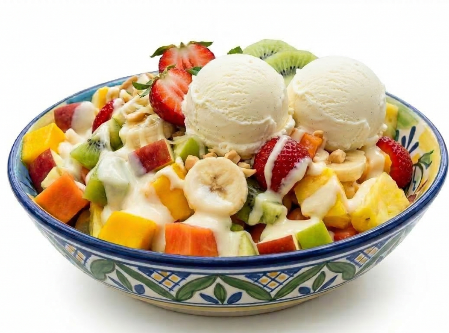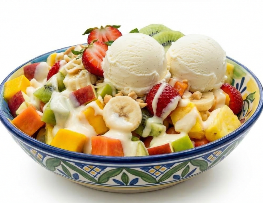 Deliciosa ensalada de frutas acompañada de mango, papaya, banano, fresa, manzana, kiwi, piña, leche condensada,crema de leche, 2 bola de helado a eleccion.