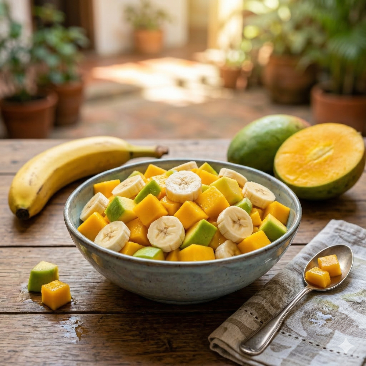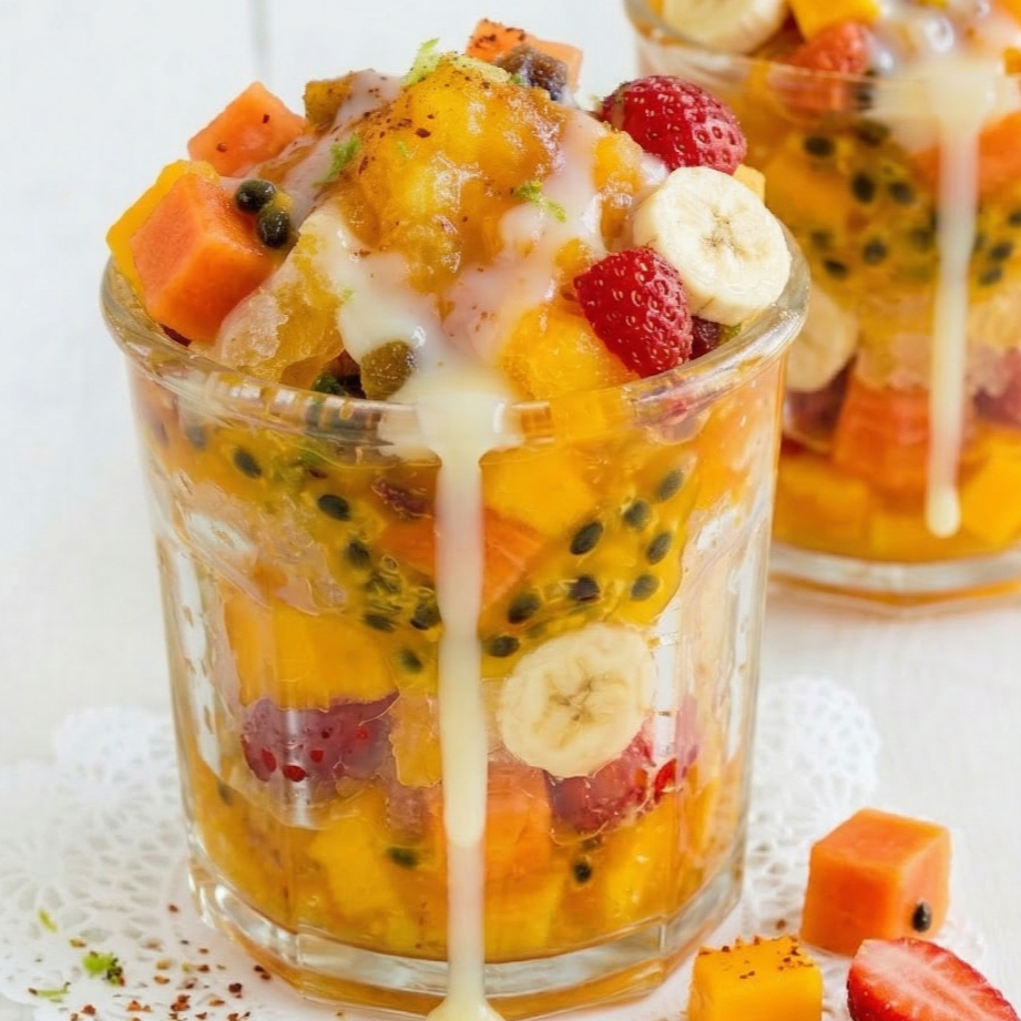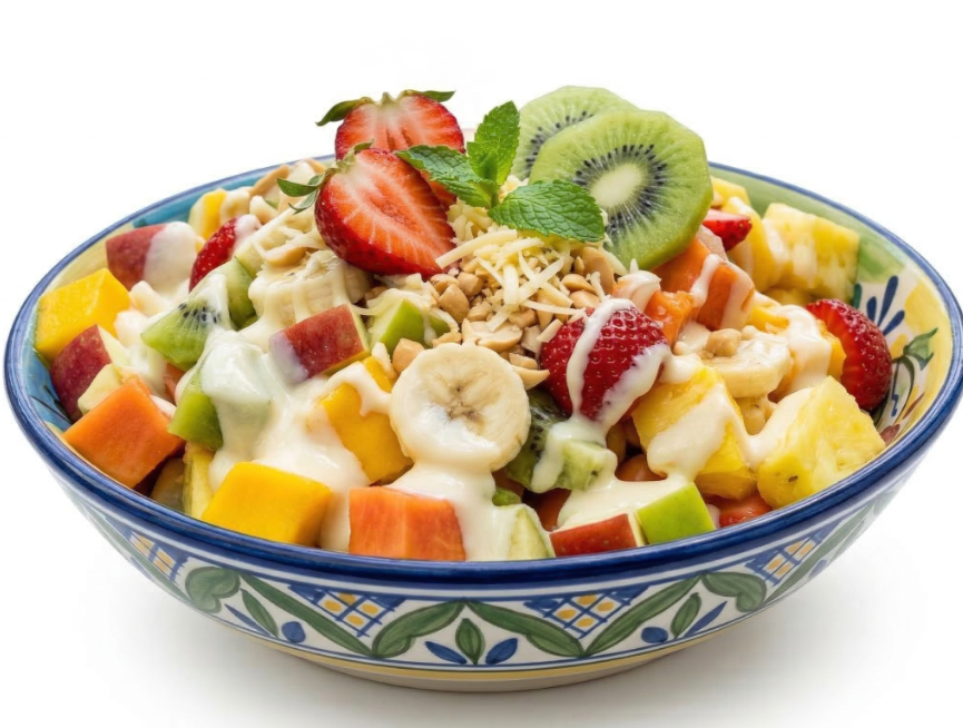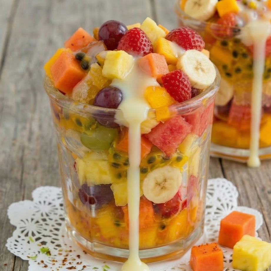 Deliciosa ensalada de frutas acompañada de mango, papaya, banano, fresa, manzana, kiwi, piña, leche condensada,crema de leche.