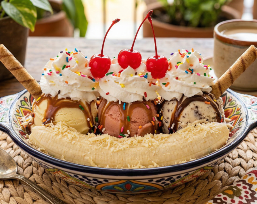Acompañado de delicioso banano, 3 bolas de helado a eleccion.