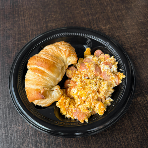Huevos en cacerola, mas dos salchichas rancheras, producto de panadería.
