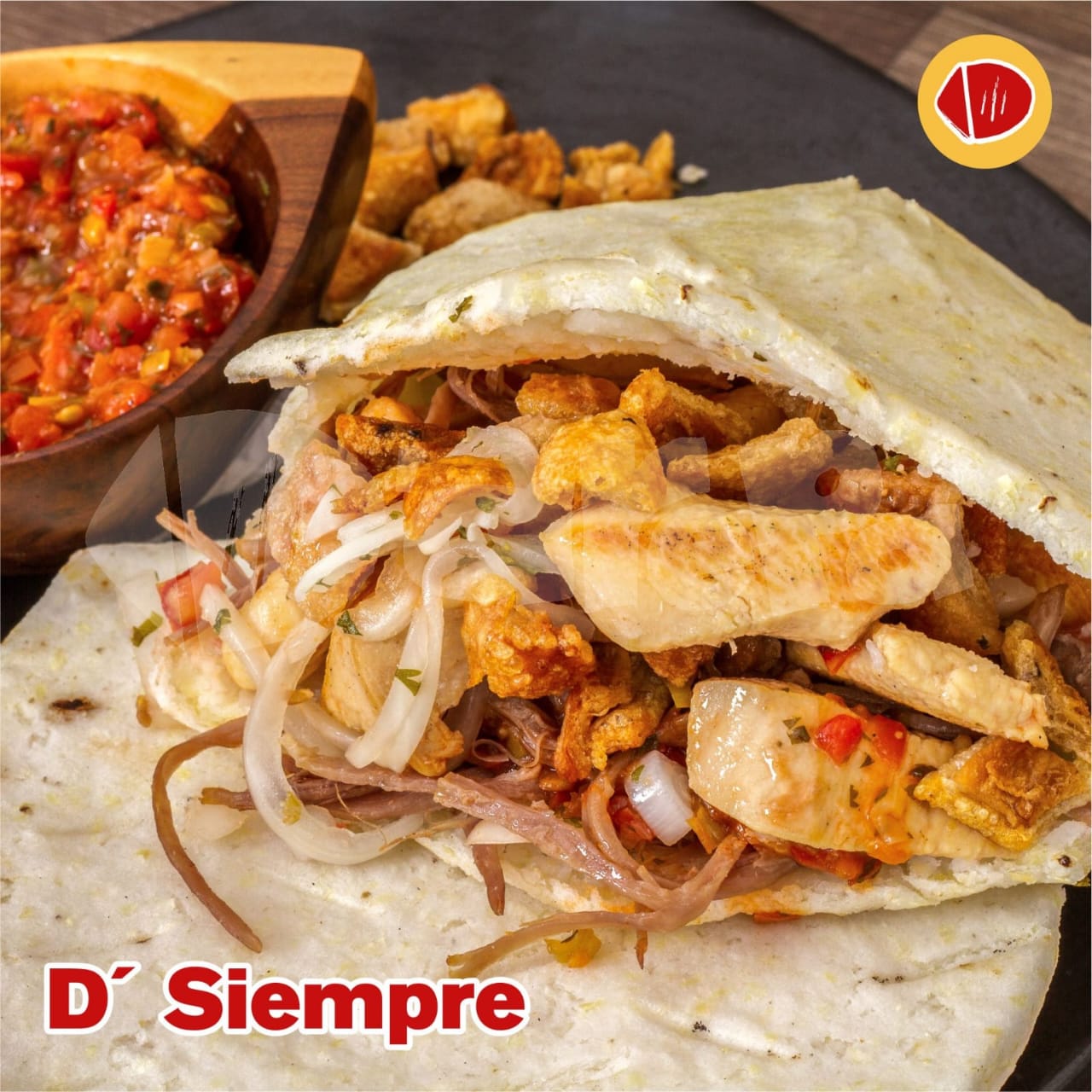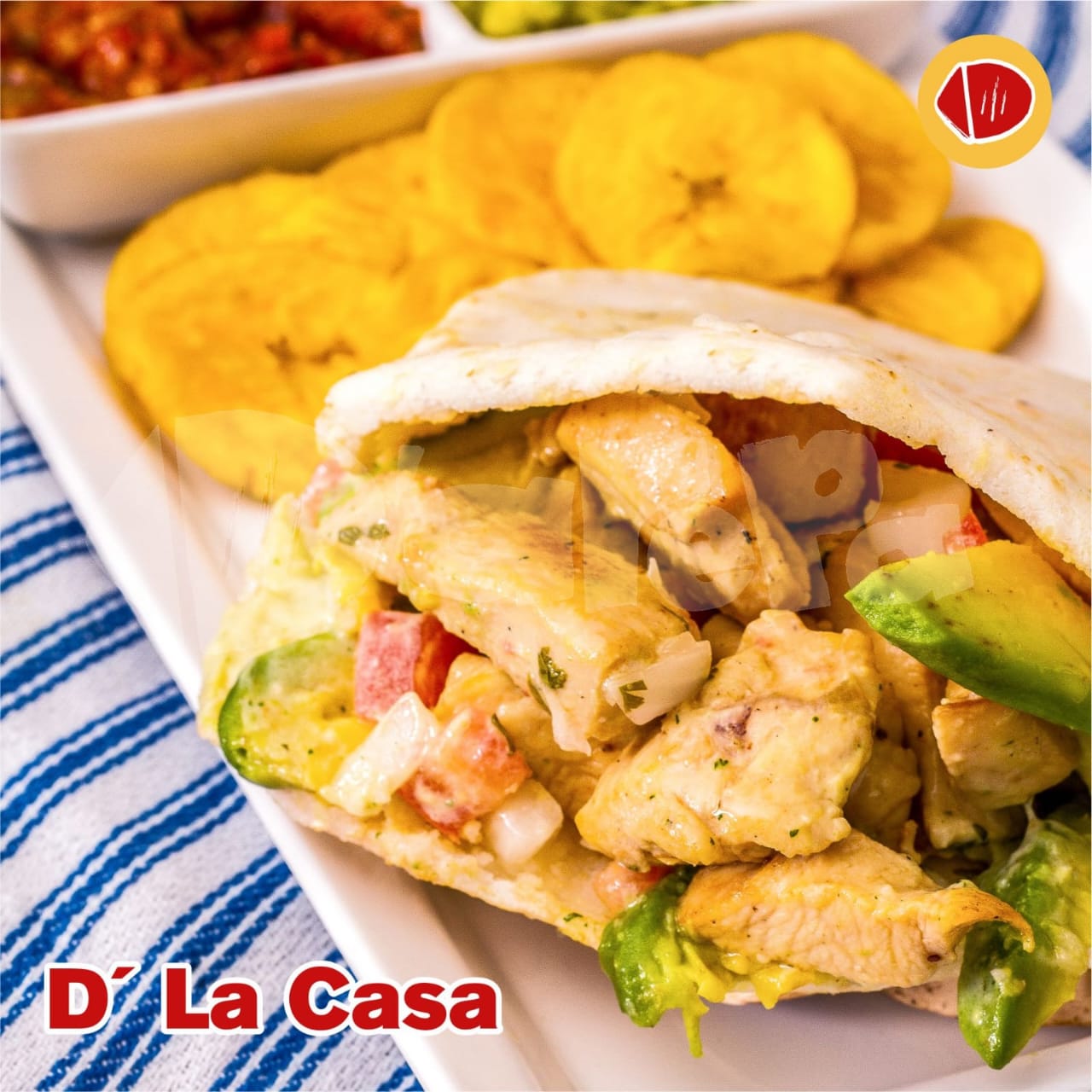 Delicioso D´ Rollo con proteina a elección (Pollo o Cerdo), tomate, cebolla, lechuga, queso y salsa de la casa.