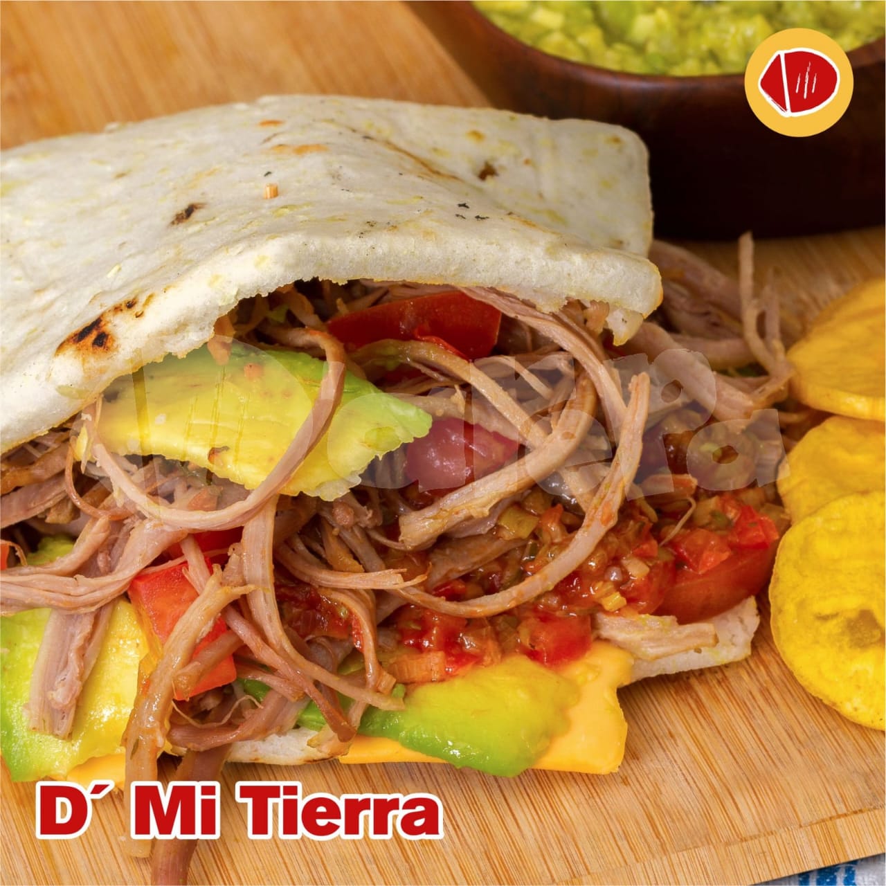 Arepa, queso, carne mechada, aguacate, tomate y hogo.