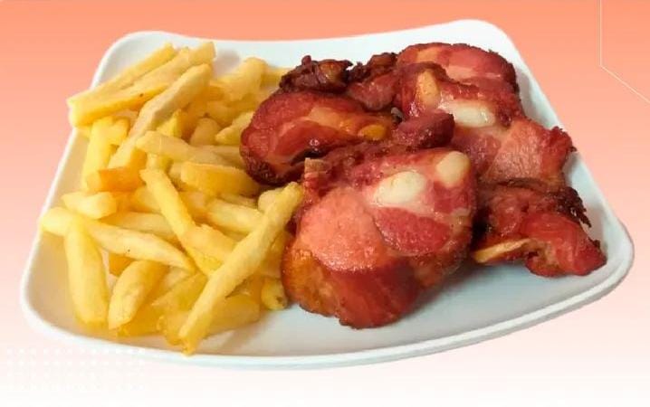 Porción de costilla ahumada y papa a la francesa.