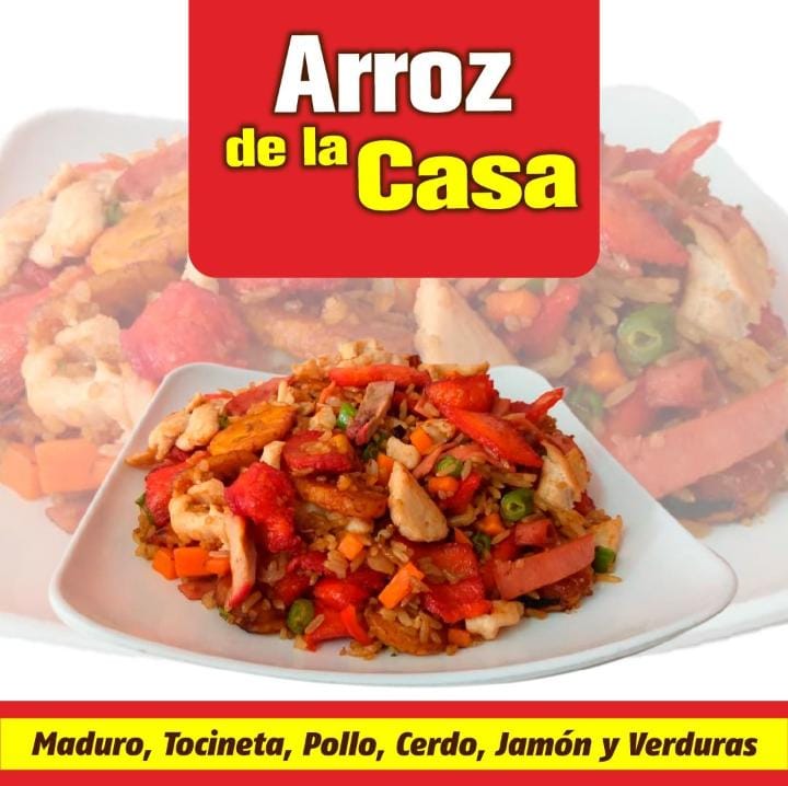Maduro, tocineta, pollo, cerdo, jamón y verduras zanahoria y habichuela.