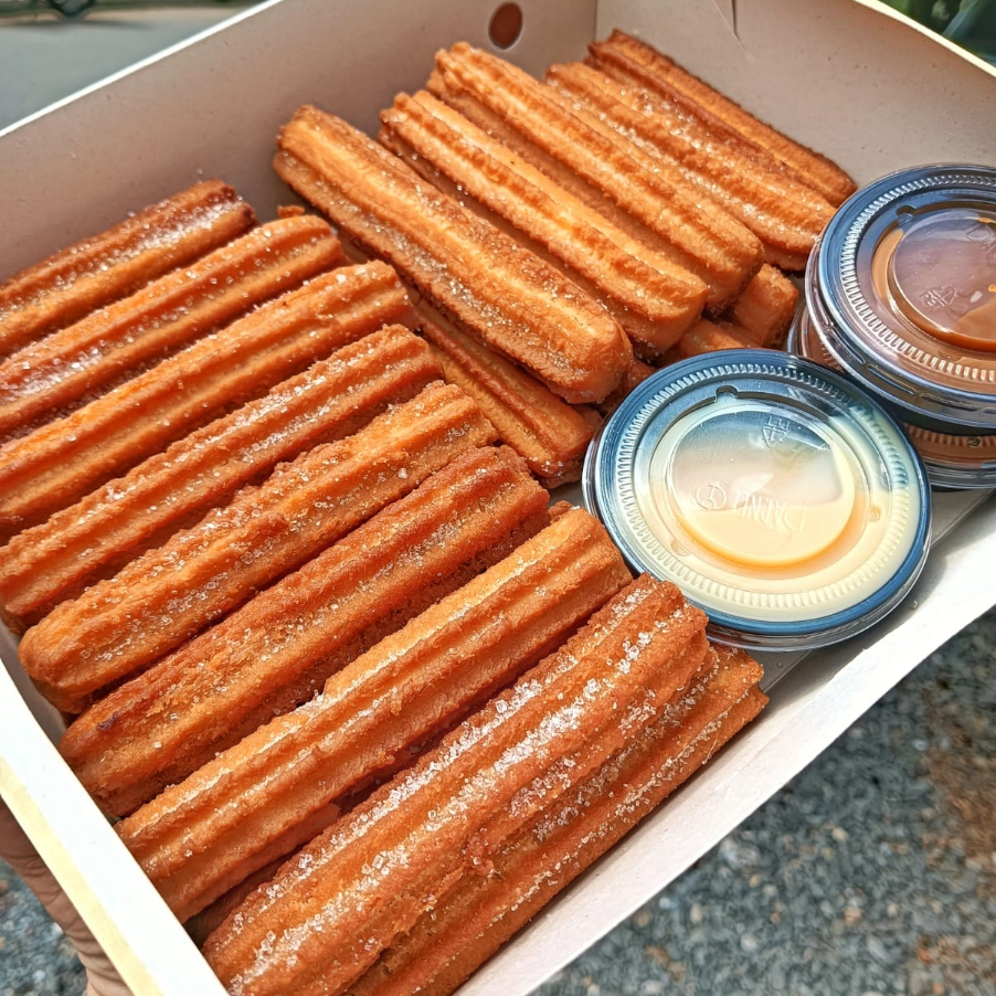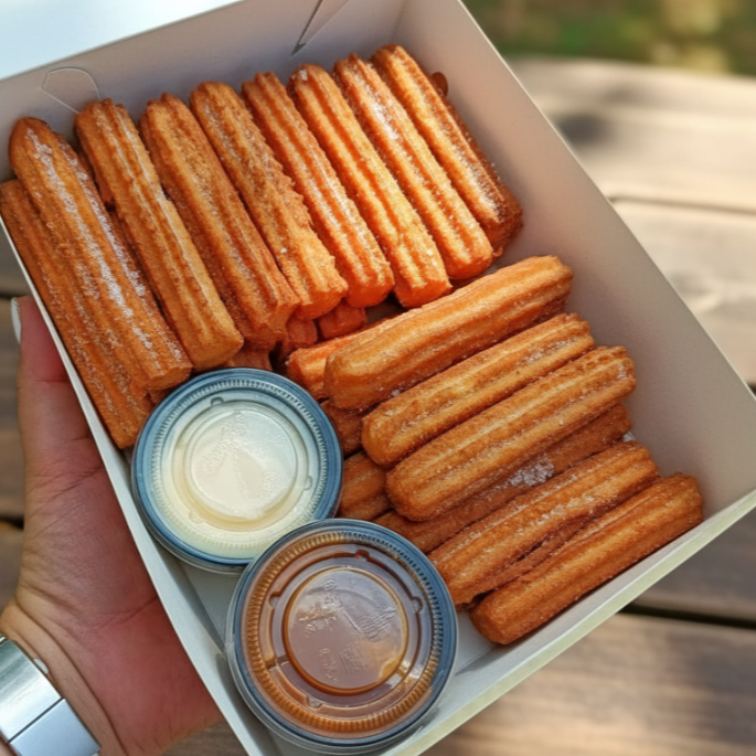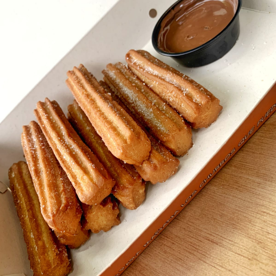 18 churros con azucar y 2 delicosas salsas a eleeccion.