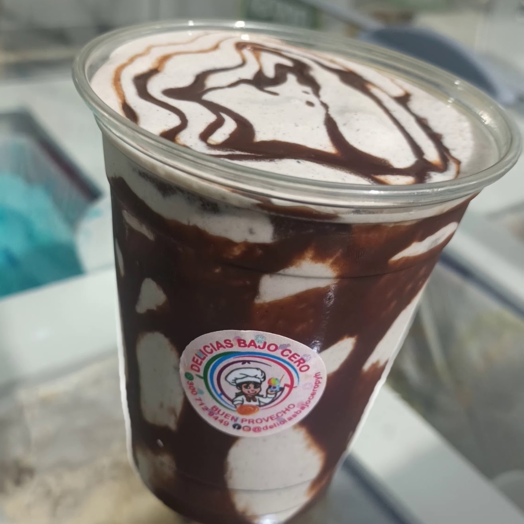 A base de leche con helado sabor Cappuccino, Chantilly, chips de chocolate y salsa de chocolate.