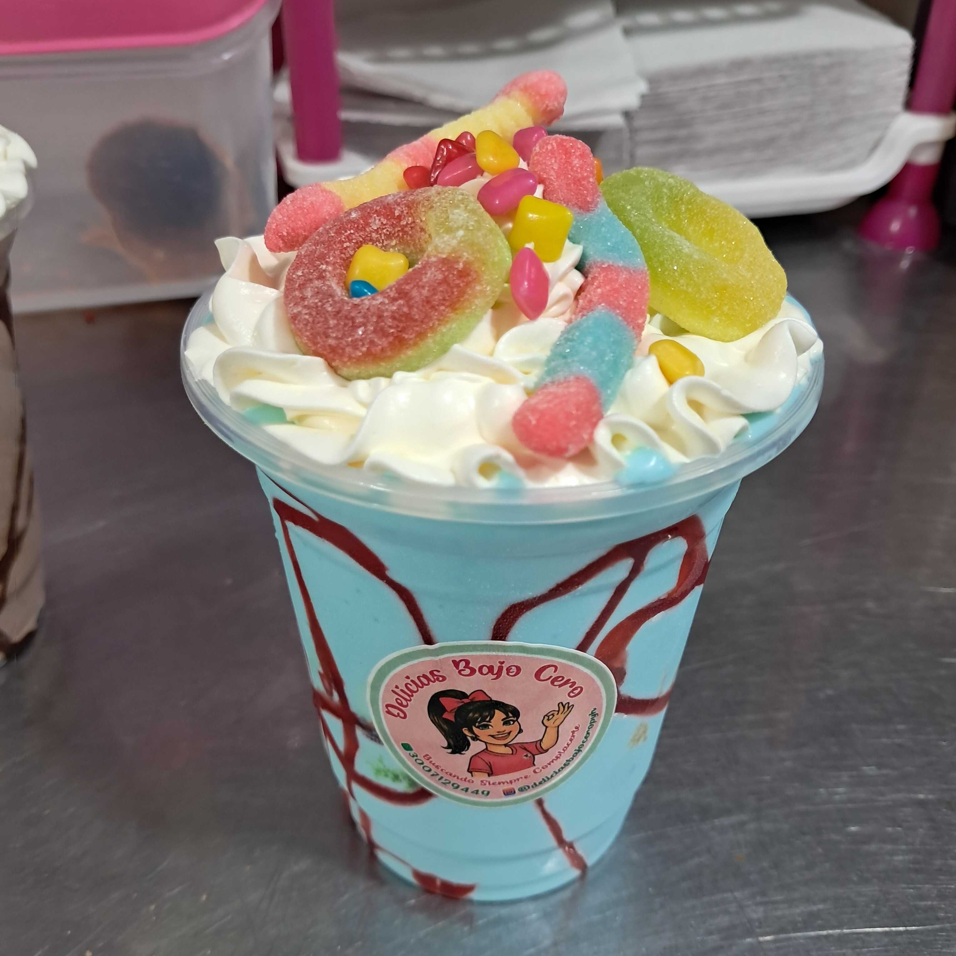 A base de leche con helado sabor Chicle, Chantilly, gomitas, chicles y glaseado de chicle.