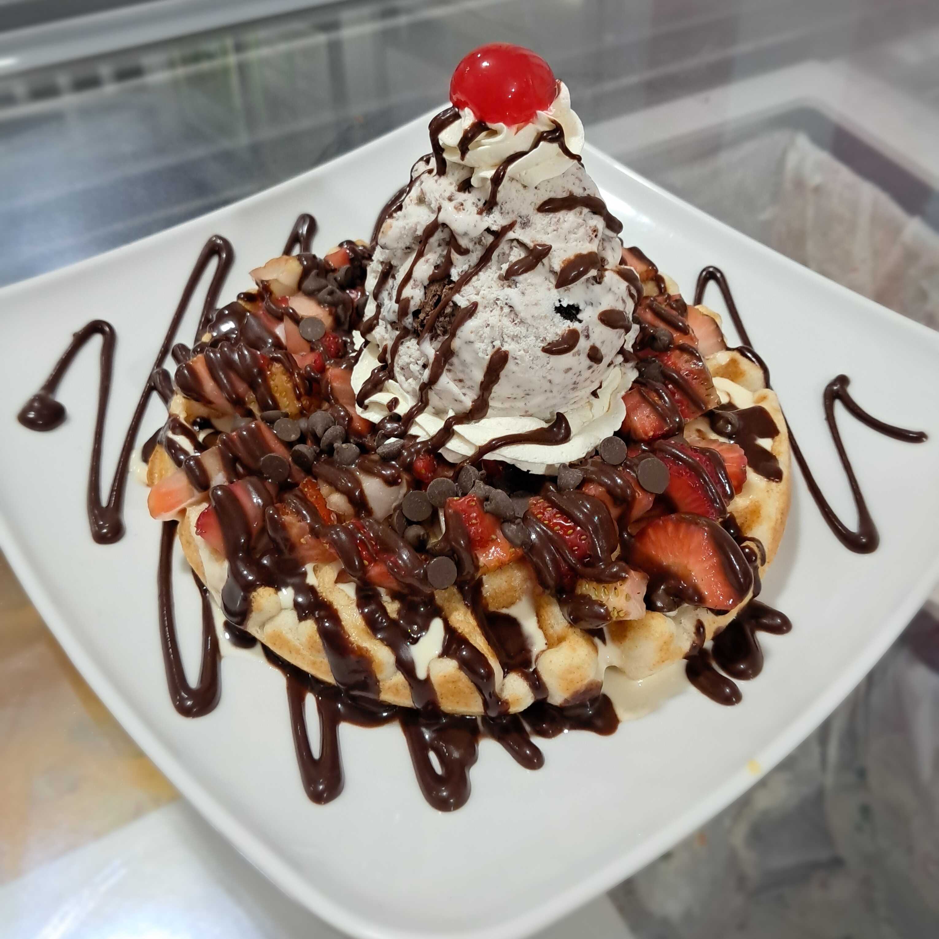 Fresa picadas, crema de la casa, mermelada o salsa, queso y tus sabores de helados favoritos.