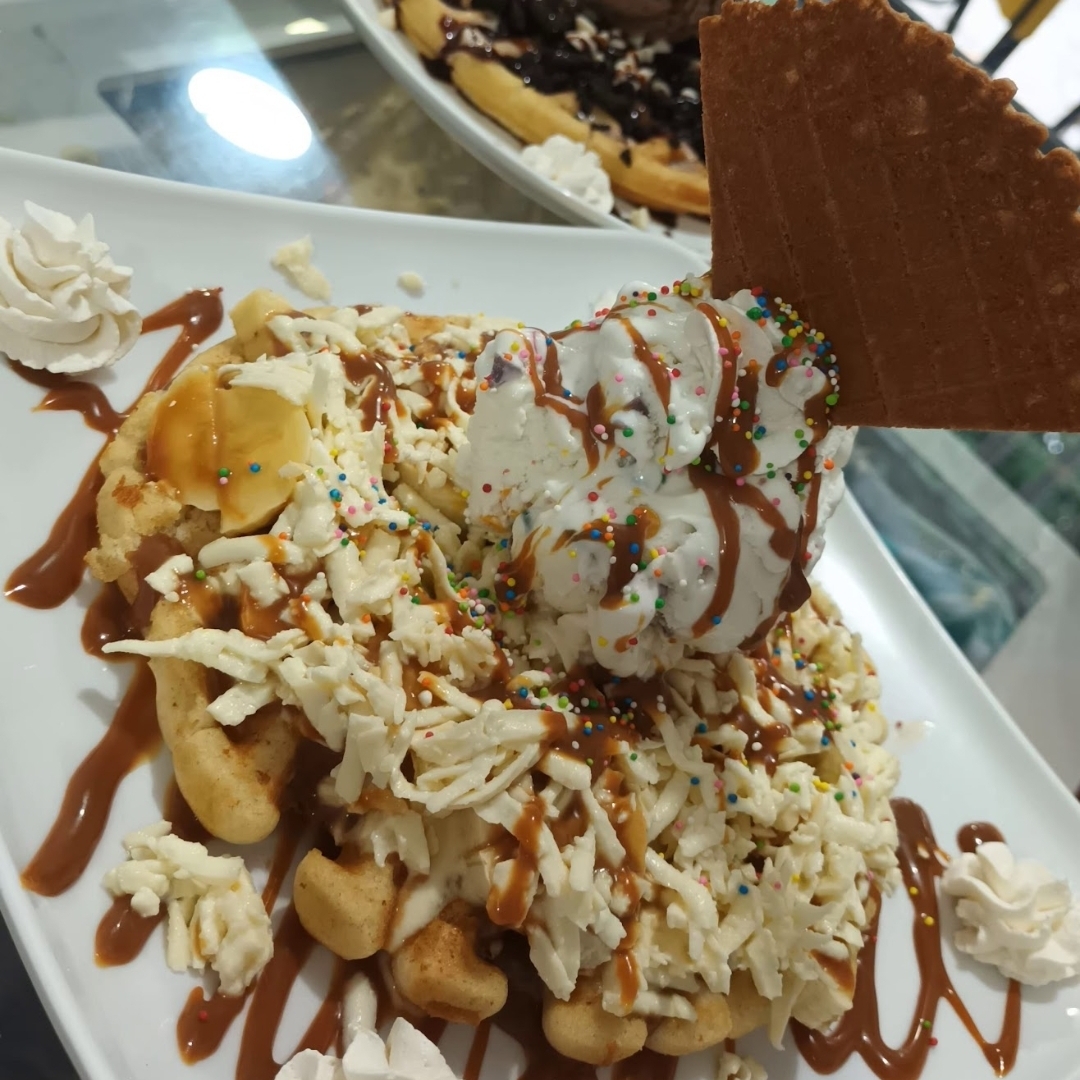Arequipe, chantilly, lecherita y queso. También escoge 3 opciones entre maní o coco, mermelada de mora, maracuyá o salsa de chocolate, fresa y/o durazno picado; y acompaña de tu sabor de helado favorito.
