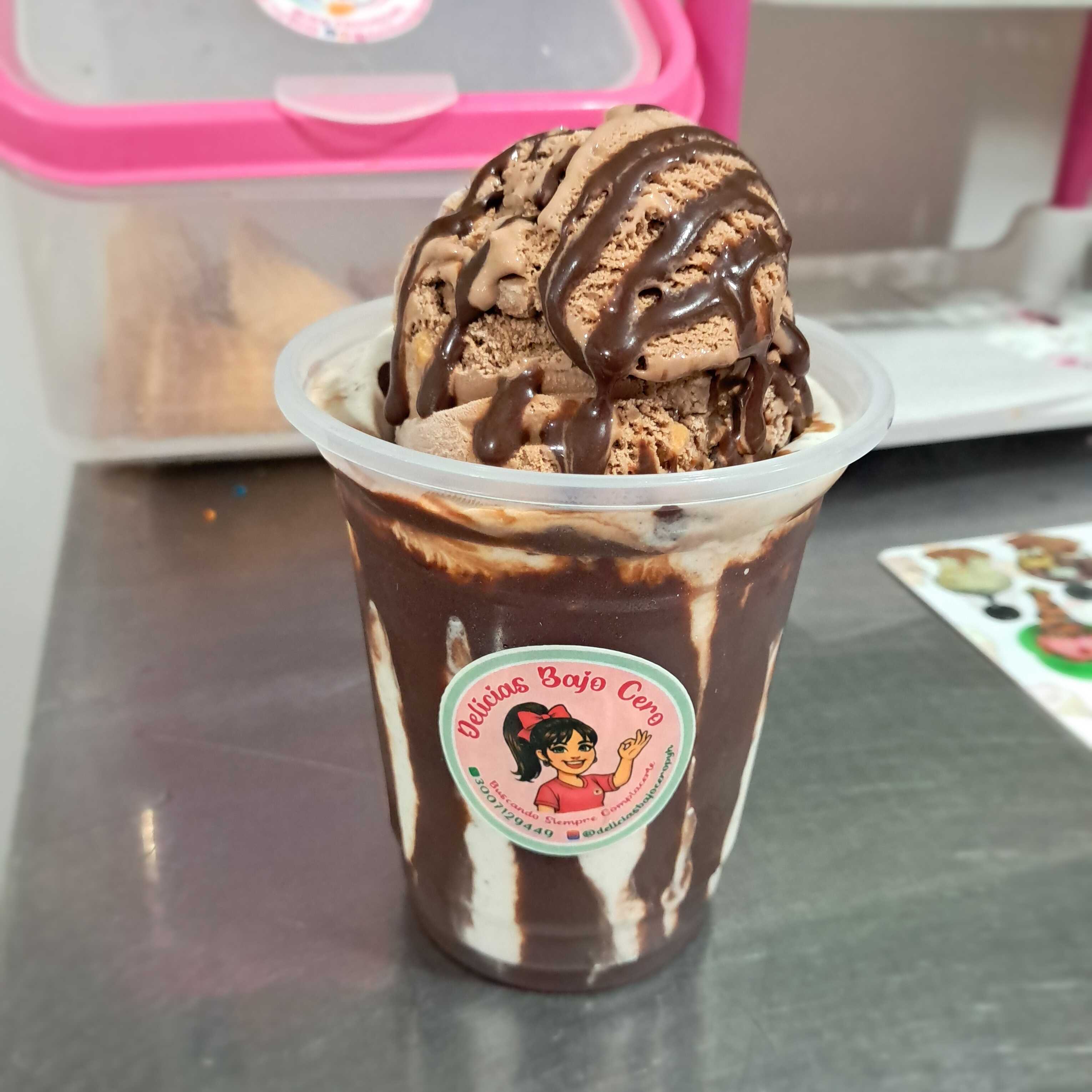 2 bolas de helado, crema de la casa, salsa de chocolate, trozos de brownie y cerezas.