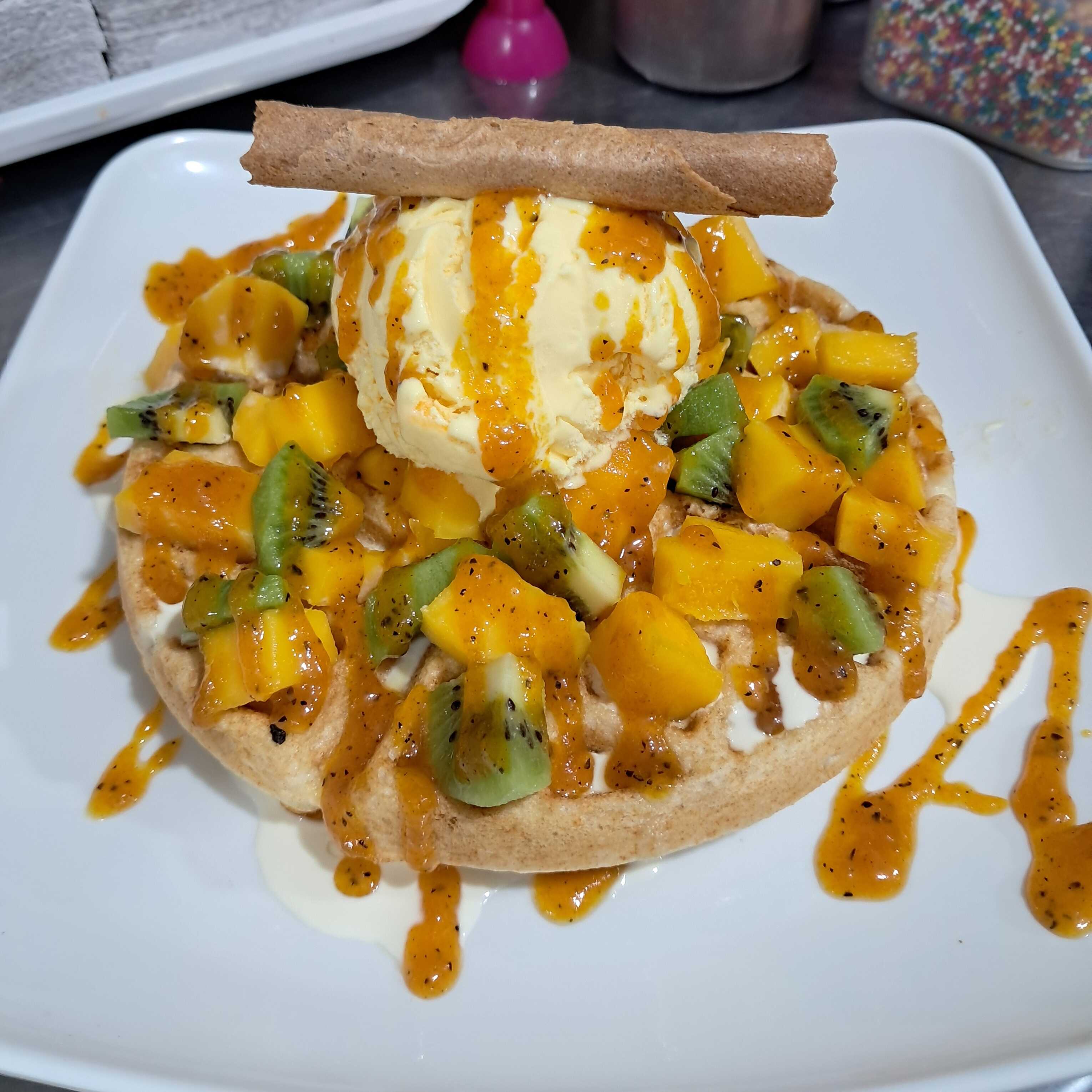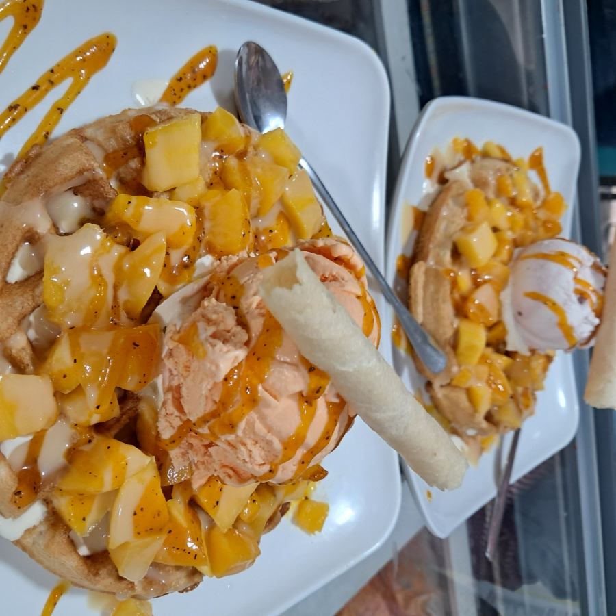 Trozos de durazno y mango maduro, salsa de maracuyá, crema de leche y lecherita. Acompañado de tu sabor de helado favorito.