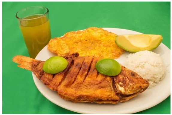 Tilapia frita, tostada de plátano, porción de arroz, ensalada de la casa, principio a elección (frijoles, papas a la francesa, lentejas, puré de papa) y limonada 250 ml. Puedes acompañarlo con tu sopa ideal (sancocho de pescado, caldo de costilla, caldo de pajarilla).