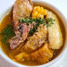 delicioso sancocho acompañado de papa, yuca, carne de res, carne de cerdo, pollo