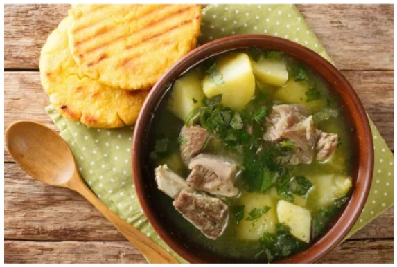 Caldo de costilla de res y papa con arepa pequeña de maíz.