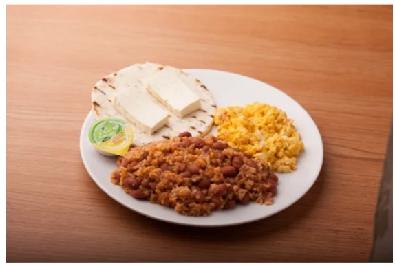 Desayuno con arroz, huevos rancheros, tajada de maduro, arepita de maíz + ¡Café en leche 8 oz!