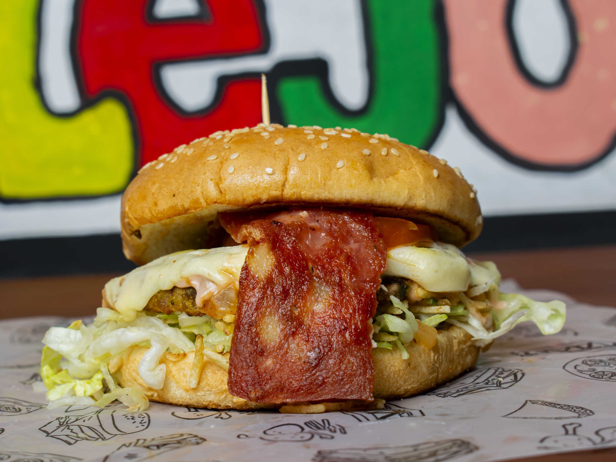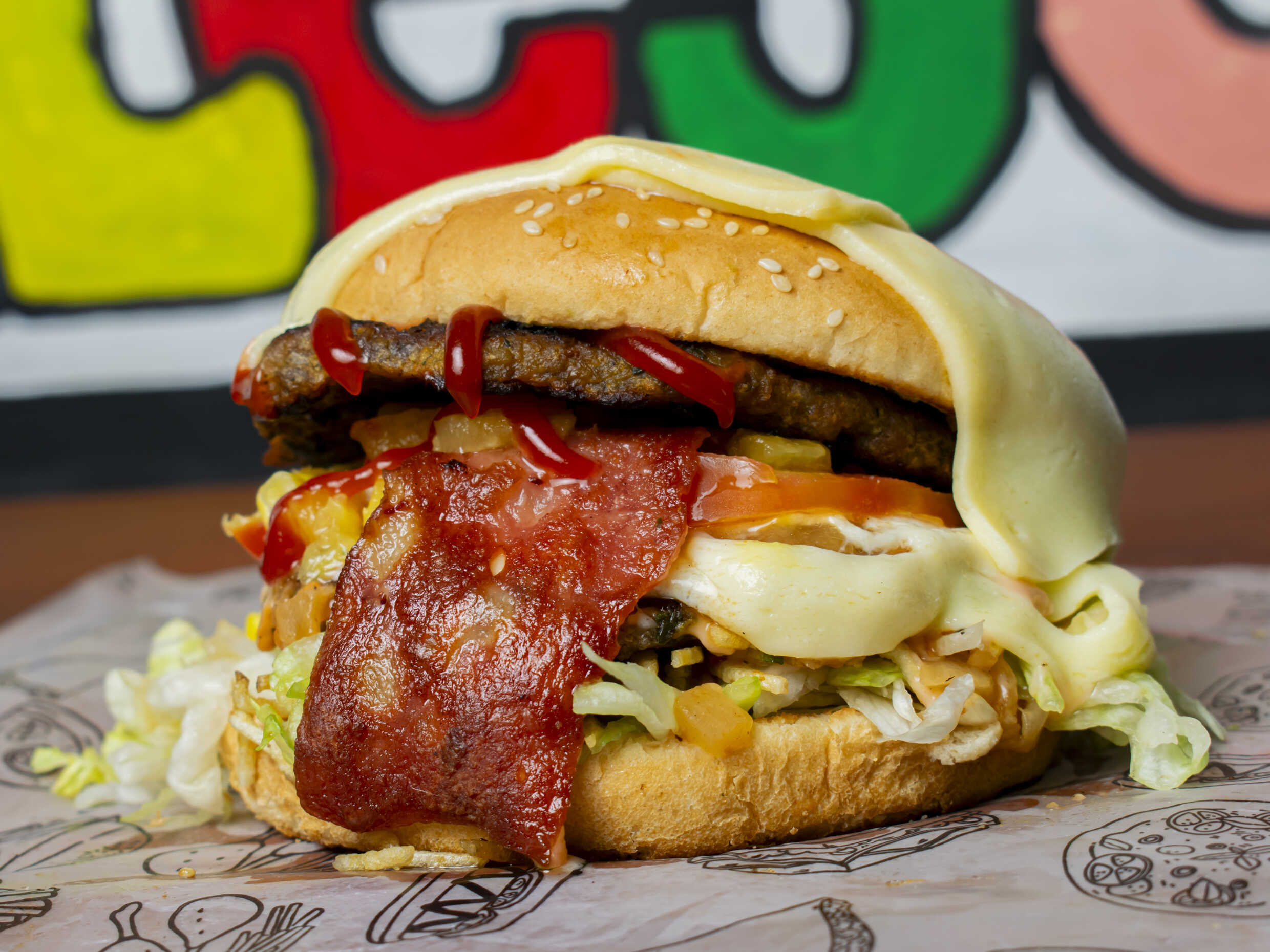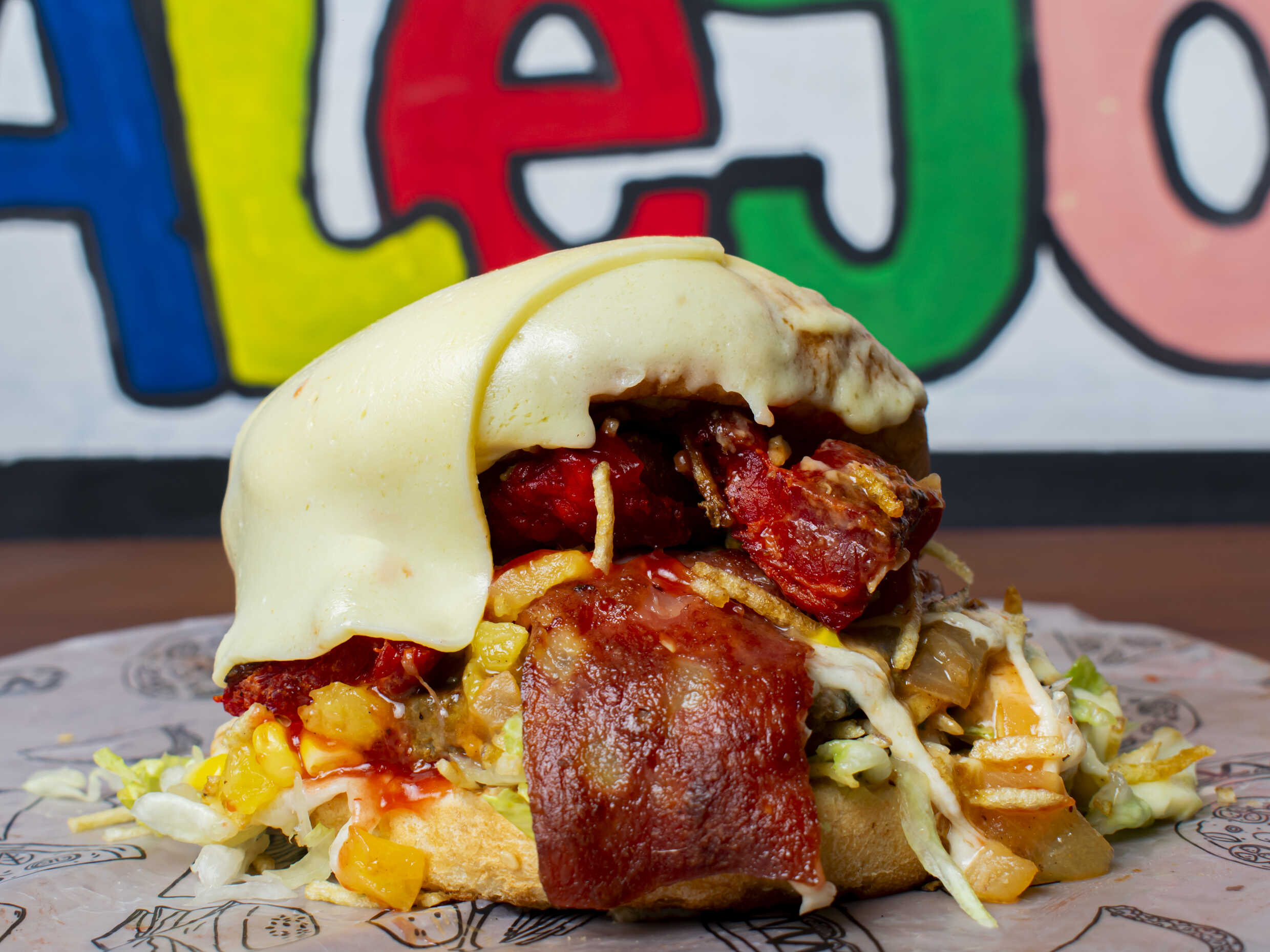 Pan, lechuga, ripio, doble carne, piña calada, tocineta cebolla, queso fundido y tomate.