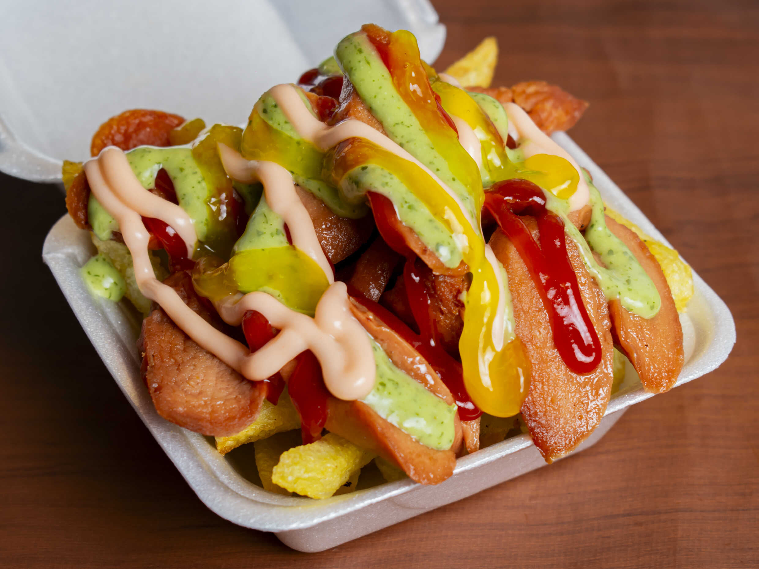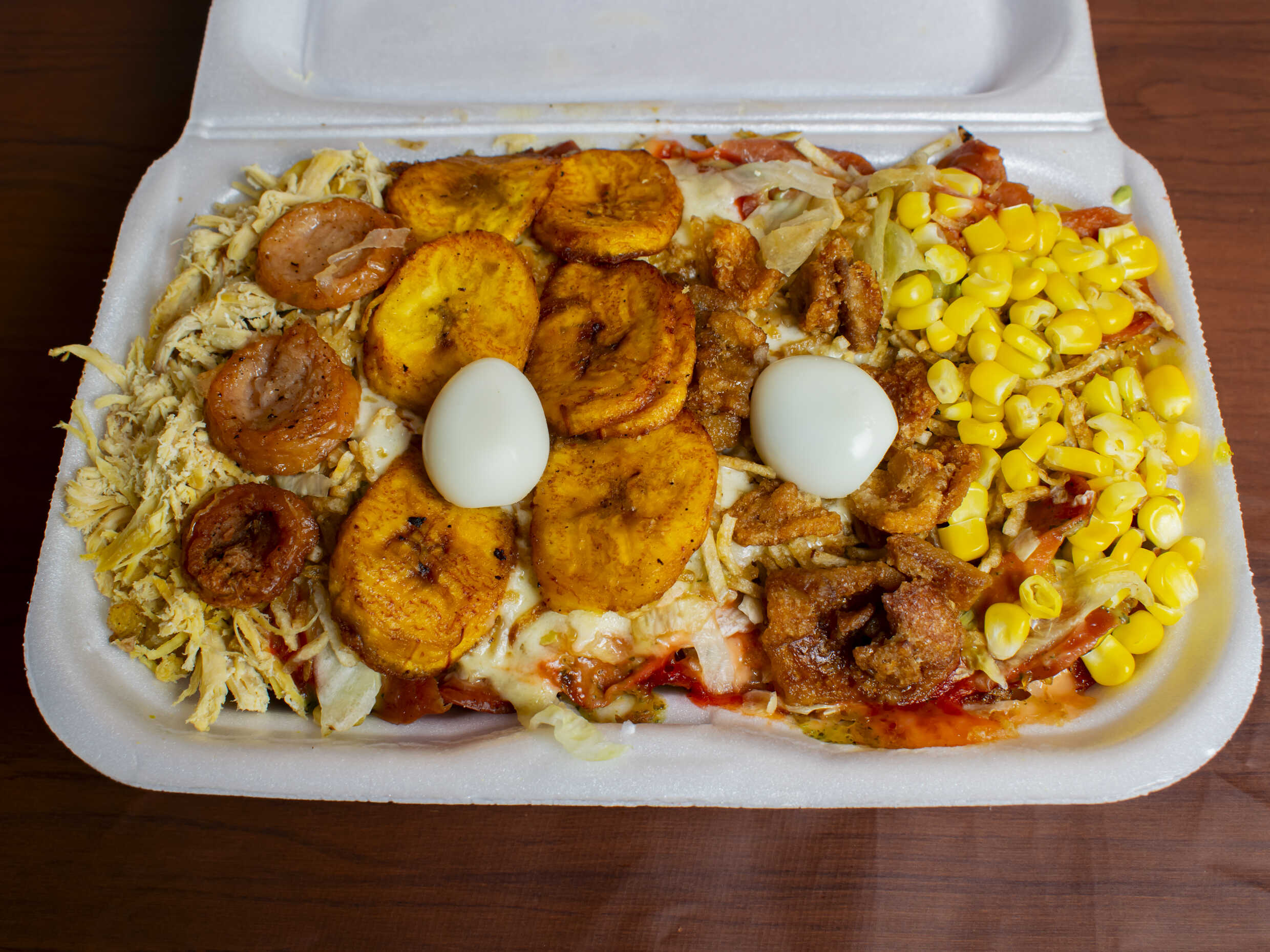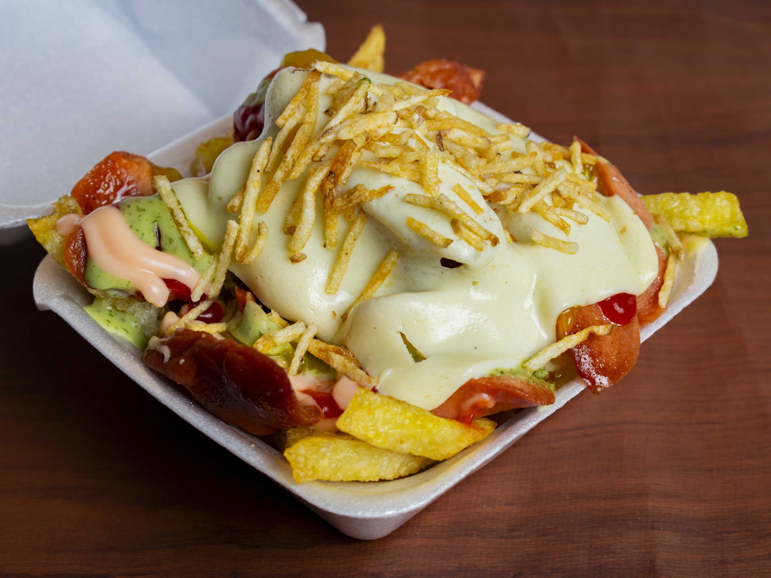 En caja C1 - Papas a la francesa , salchicha, lechuga, queso, salsa de la casa, ripio, maicitos, chicharrón, maduritos, chorizo, pollo, huevo de codorniz.