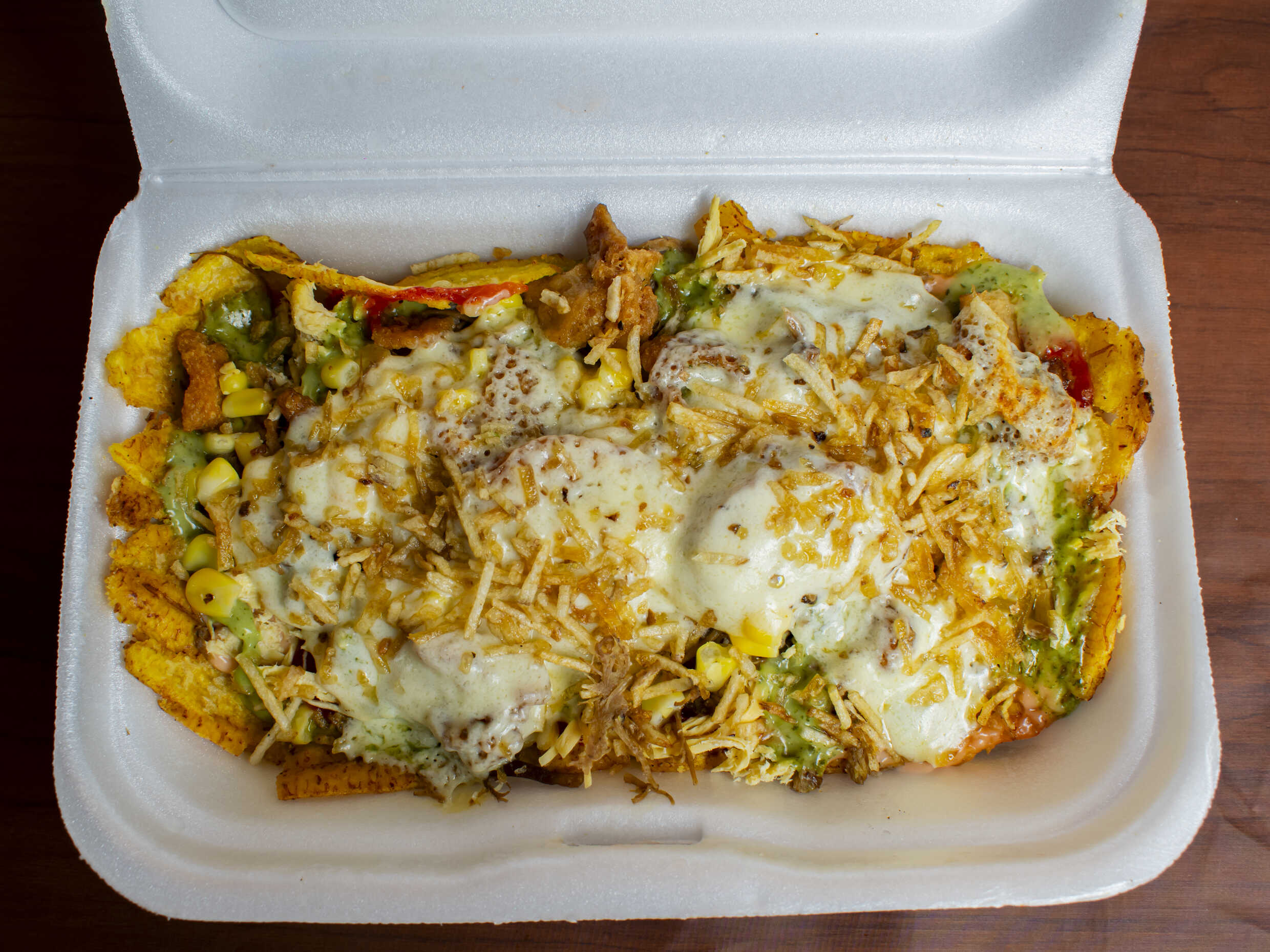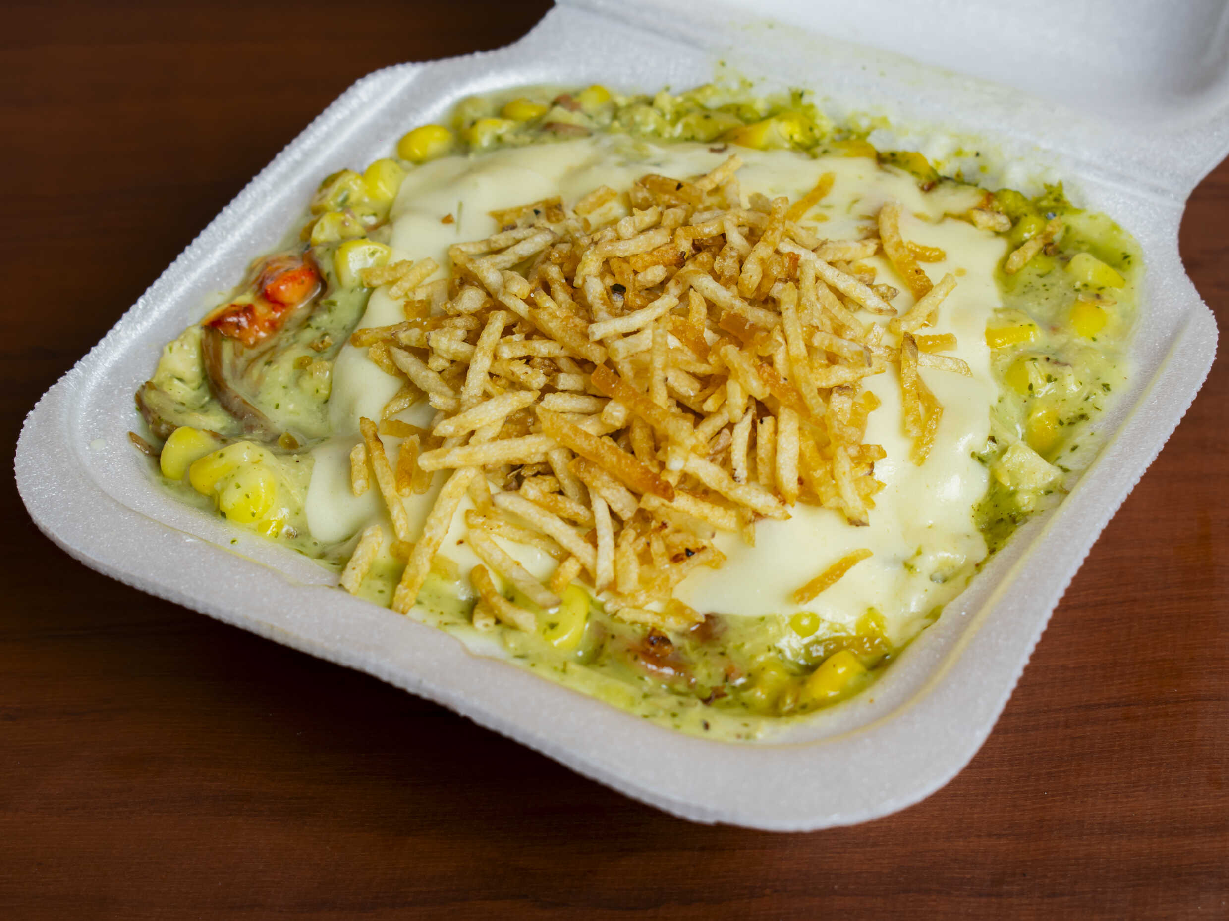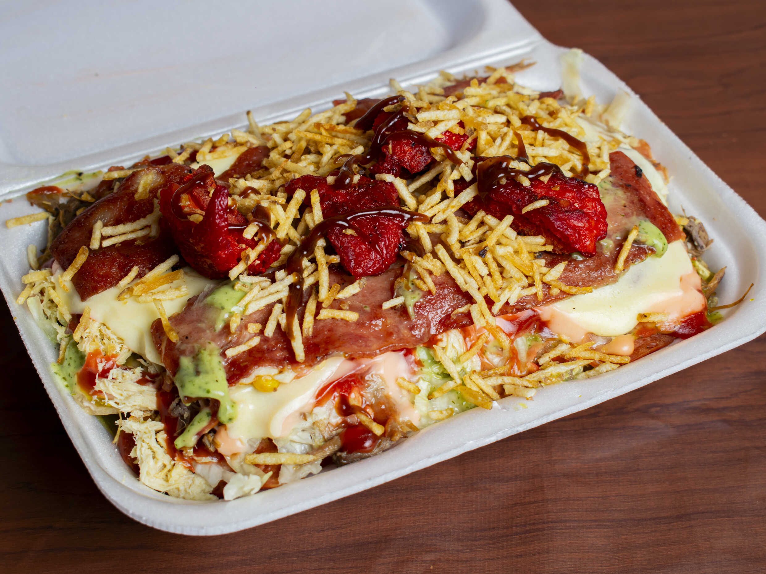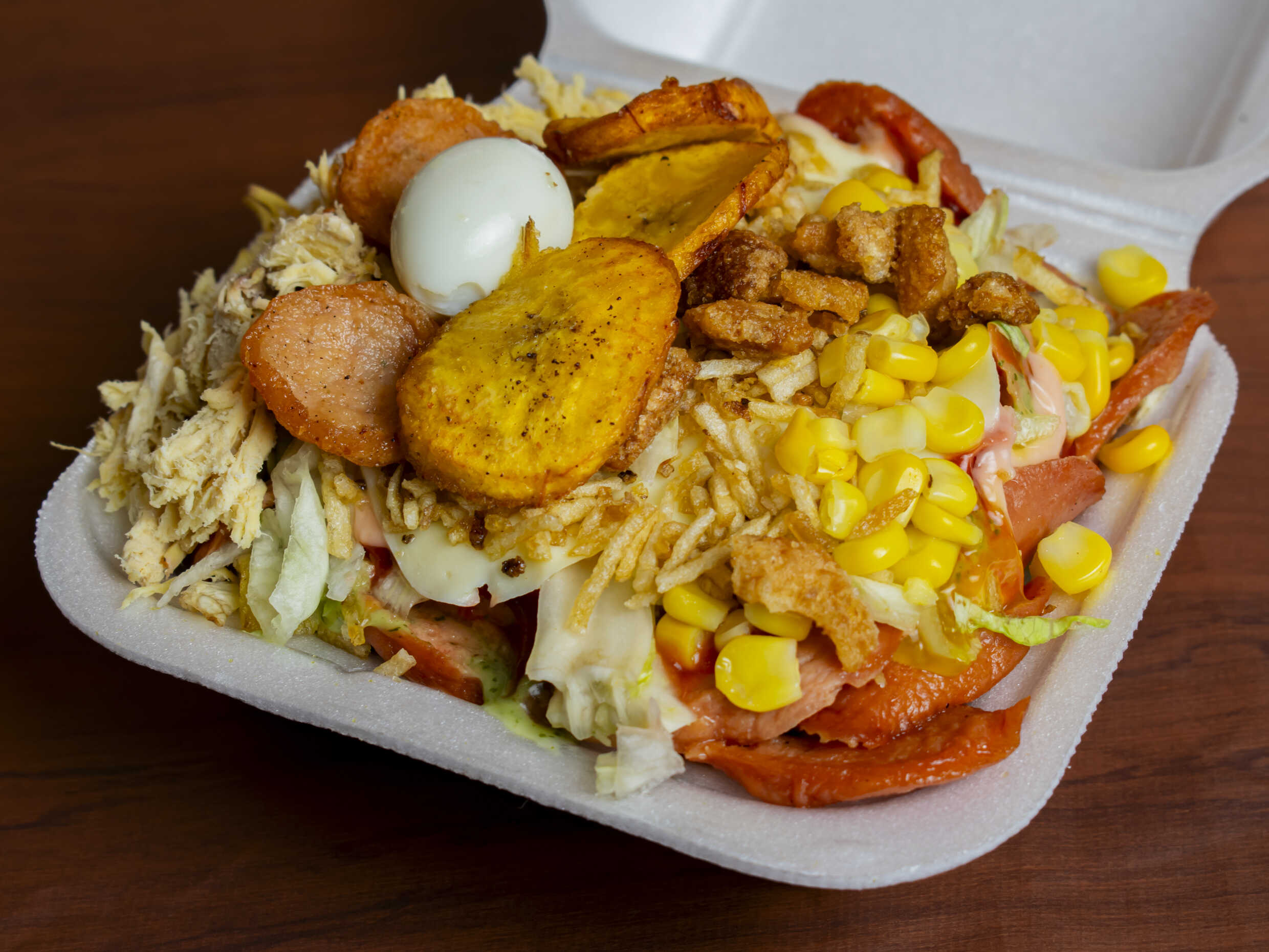 En caja C1 - Papas a la francesa , salchicha, lechuga, queso, salsa de la casa, ripio, maicitos, chicharrón, maduritos, chorizo, pollo, huevo de codorniz.
